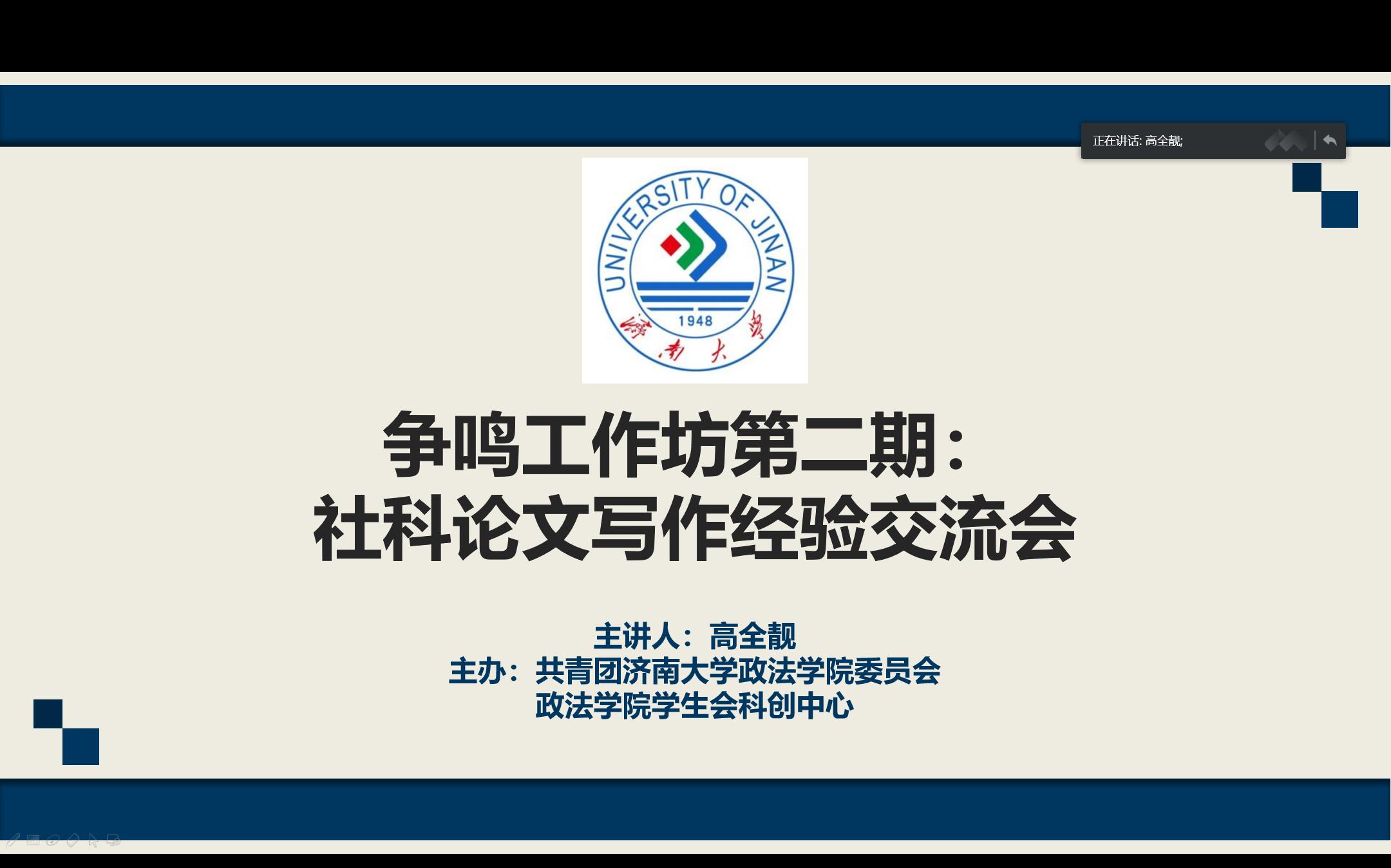 本次经验交流会,高全靓围绕论文结构进行了详细深入的讲解,重点为同学们讲解了常见的研究方法、文献综述撰写方法、论文摘要写作技巧、引用文献的规范格式、数据分析处理方法等,展现了其对于社科论文写作的的独到见解。会议临近结束,高全靓分享了朱丽敏老师对同学们诚挚的寄语。同学们感受颇深,深受鼓舞。最后线上交流环节,同学们踊跃提出问题,表达自己的疑问。高全靓就同学们提出的问题做出了详尽的解答,消除同学们关于社科论文写作方面的疑问。