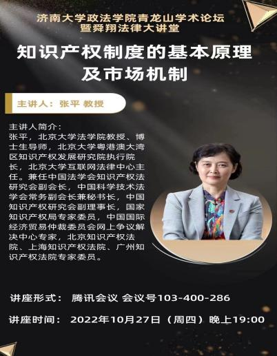 青龙山学术论坛暨舜翔法律大讲堂于线上举办,此次讲座特别邀请北京大学法学院教授、博士生导师张平教授做题为《知识产权制度的基本原理及市场机制》的学术报告。讲座由毛巾哥