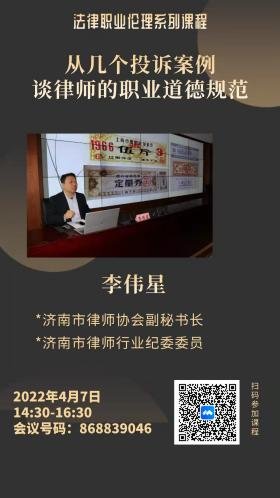 法学专业优秀校友,济南市律师协会副秘书长、济南市律师行业纪委委员李伟星线上做了《从几个投诉案例谈律师的职业道德规范》的报告。学院党委书记徐庆国,学院党委副书记、副院长李涛,学院部分教师及全体法律硕士研究生60余人参加,报告由刘康磊副教授主持。