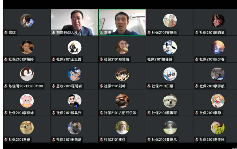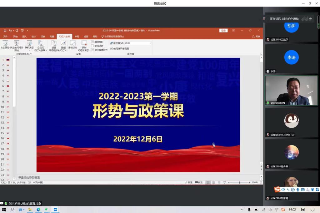2021级劳动与社会保障专业学生讲授2022至2023学年第一学期形势与政策课,本次课程采用腾讯会议线上方式进行,学院党委副书记、副院长李涛,21级辅导员宗琪与学生们一同参加了本次课程。