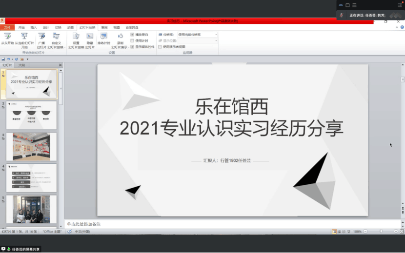随后,2019级马璐媛、任荟芸两位同学结合从自身经历分享了自己的认识实习体会。马璐媛以自己在泺源街道党政办公室的实习经历为例,从街道治理的角度出发,讲述了实习中的感悟和思考,建议同学们在学好专业知识的同时,做到理论和实践相统一,知中有行,知行合一。