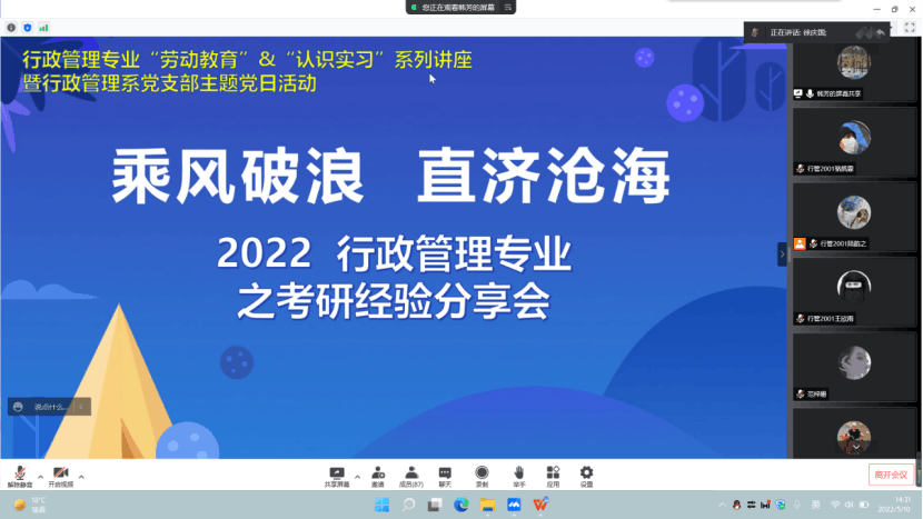 行管系20级“劳动教育”&“认识实习”系列讲座暨党支部主题教育活动之2022年考研经验分享会通过腾讯会议平台线上成功举行。学院党委书记徐庆国、正处级组织员国迎春、行管系全体师生参加,韩芳老师主持会议。