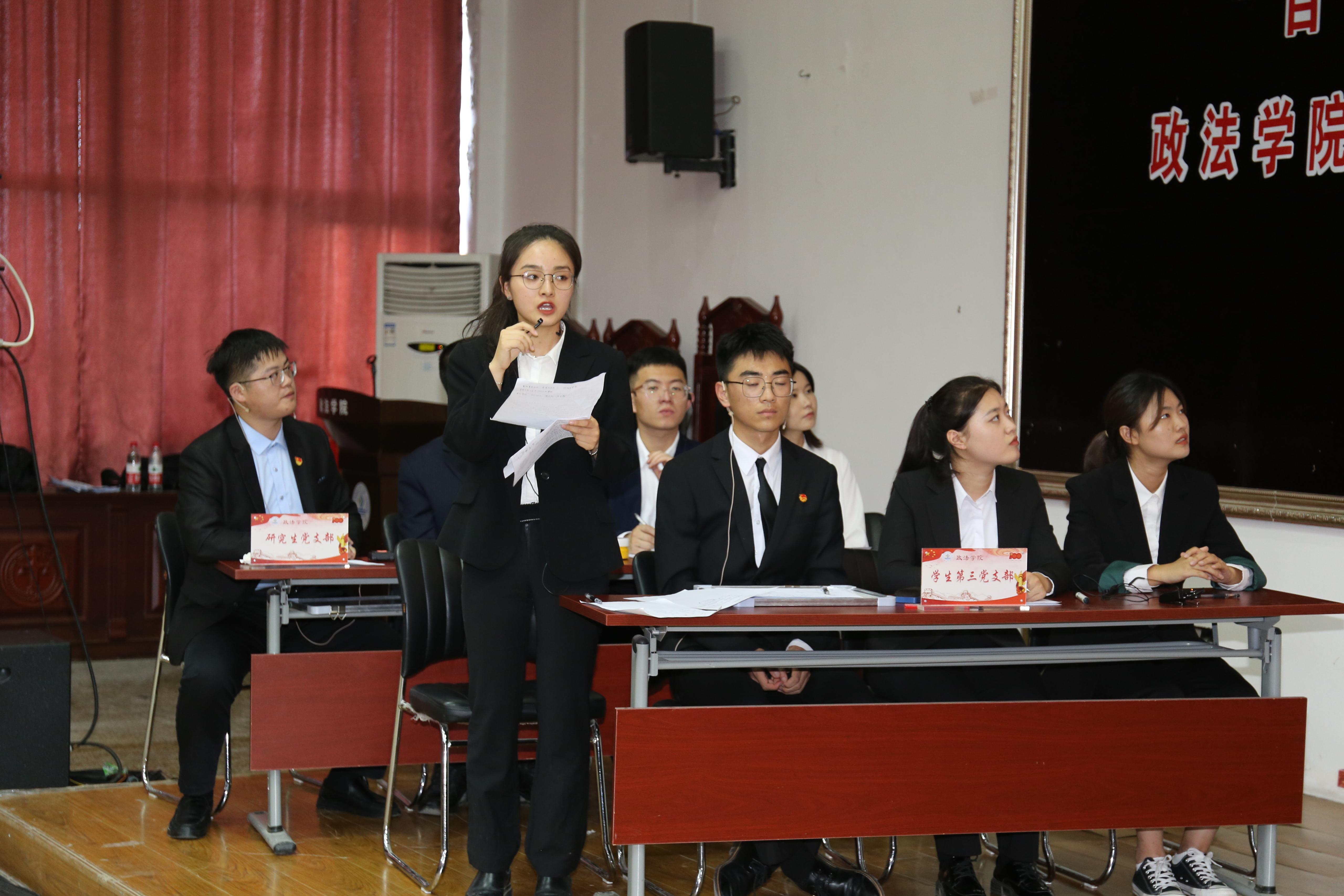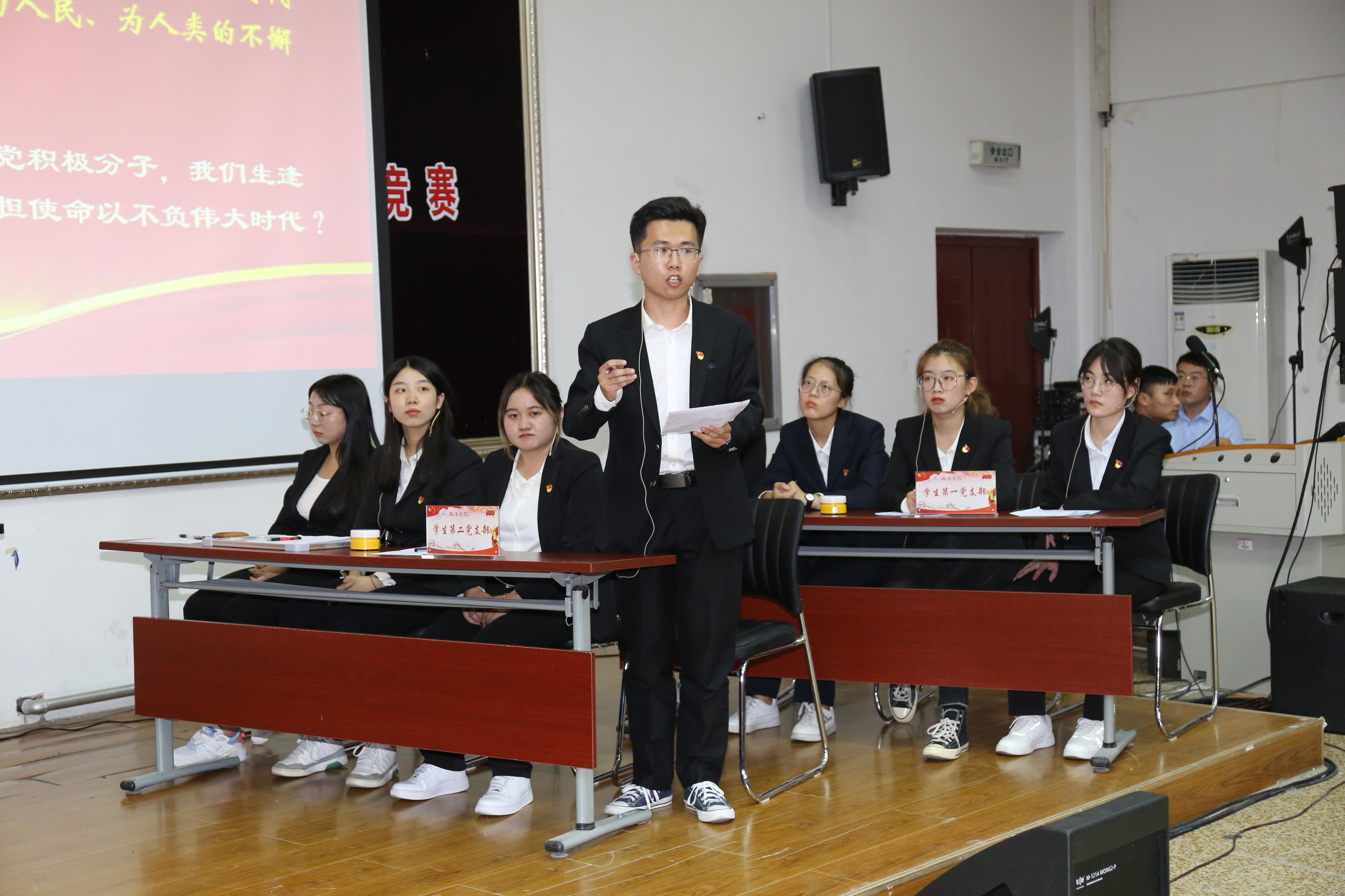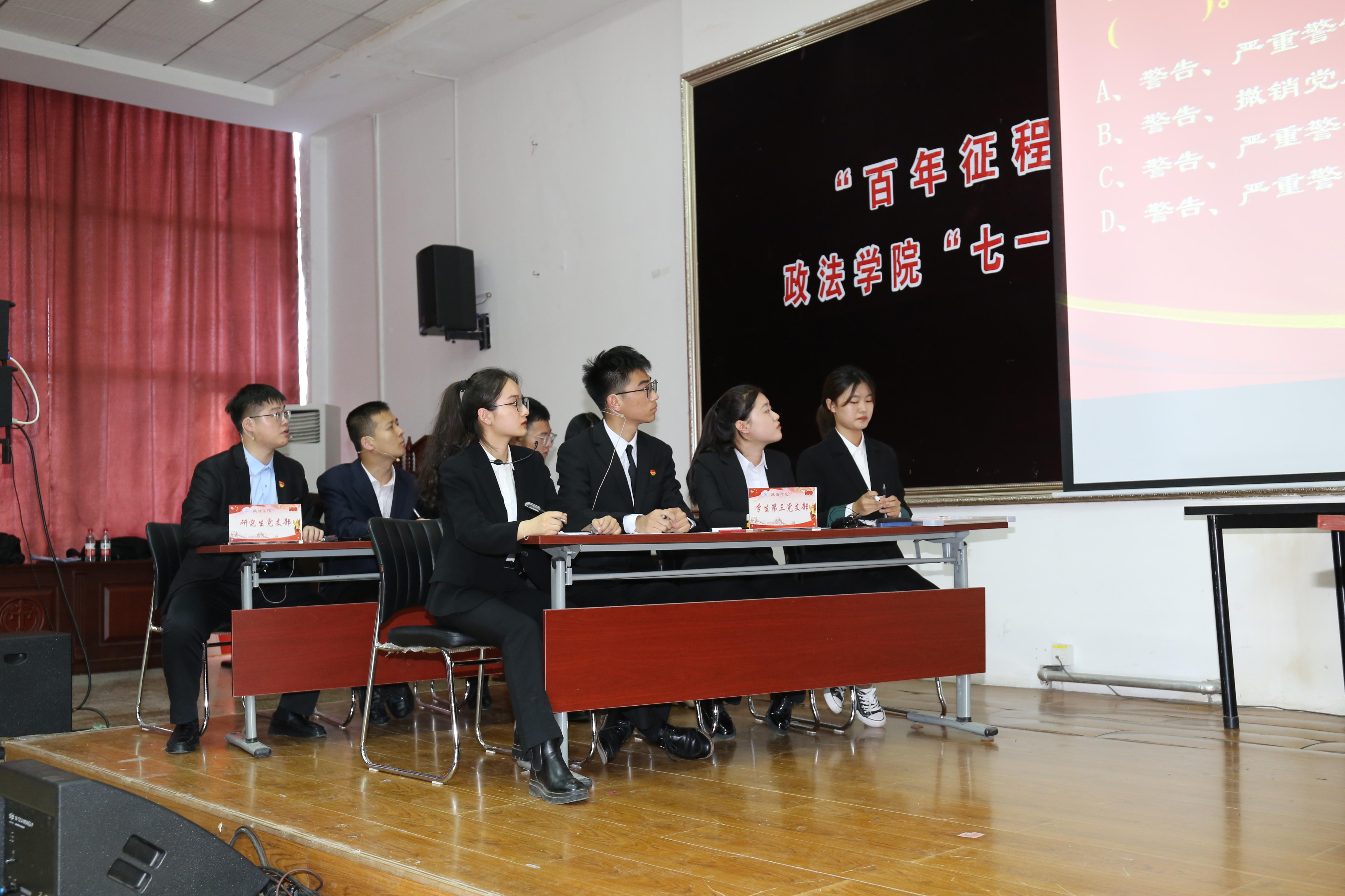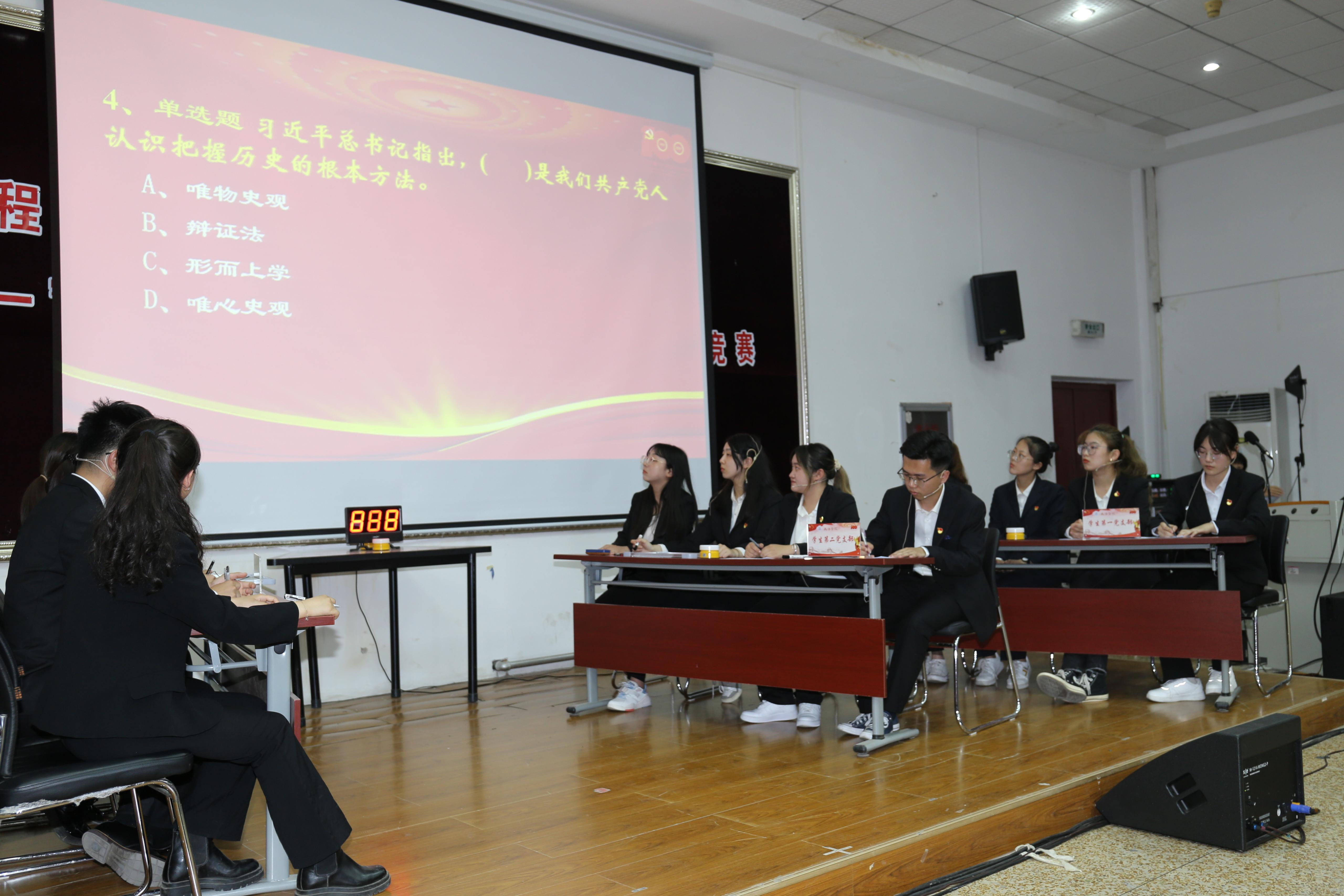 四个学生党支部代表队参赛,题目涵盖党史党建、新中国史、习近平新时代中国特色社会主义思想、党的十九届五中全会精神、时事政治等内容,比赛分为必答、抢答、观众必答、冒险必答、冒险选答和材料分析六个环节。选手们精神饱满,斗志昂扬,尤其面对学习党史的重要意义、学生党员队伍建设、党员模范作用发挥等材料分析题时,凭借扎实的理论基础精彩作答,由教工党支部委员组成的评委团逐一进行点评。经过激烈角逐,学生第二党支部获得一等奖,研究生党支部获得二等奖,学生第一党支部和学生第三党支部获得三等奖。比赛间隙,与会师生挥舞手中的党旗和国旗,快闪高声齐唱《国家》,激扬的歌声响彻全场。