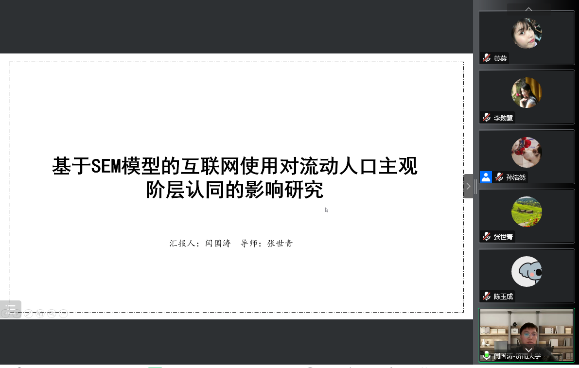 陈涓涓、李颖慧、林益利、刘珂冰、闫国涛五位同学分别就题为《附近消失:“上楼农民”的空间再造研究——基于黄河滩区孝里社区》《镜中我:自视与他视中的自我建构——以街舞工作室的身体实践为例》《城市青年群体住房拥有状态影响因素研究——基于CGSS2017数据的实证分析》《“生儿”还是“育女”:养老观念变迁对生育性别偏好的影响——来自CGSS2017的证据》《基于SEM模型的互联网使用对流动人口主观阶层认同的影响研究》的论文进行了PPT展示汇报与分享。六位点评老师对每位同学的论文题目、行文结构、研究方法、文章内容进行了评价,并有针对性地提出了修改意见。针对五位同学论文中存在的问题,老师们提醒全体同学今后应当注意:一是要注意论文题目要明确体现研究侧重的问题,确保规范性,避免出现文不对题的情况;二是论文中核心概念要界定清晰,文章内容要与理论基础紧密联系;三是要注意对定量研究的研究对象进行细致划分,论文内数据的表述要规范。最后,经评委老师投票确定陈涓涓同学获得一等奖,李颖慧、刘珂冰同学获得二等奖,林益利、闫国涛同学获得三等奖。