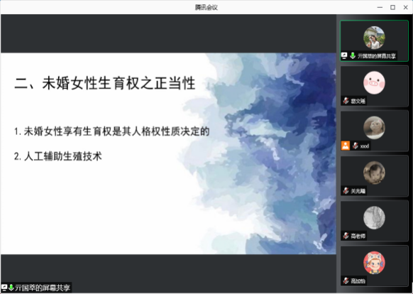 杨纪红、葛文瑶、高加怡、亓国萃、王康、甘佳其等六位同学分别就题为《我国离婚经补偿制度的实证探究》《民法典背景下彩礼返还规则分析》《婚姻存续期间分割夫妻财产制度探析和完善》《未婚女性生育权之探究》《老年人非婚同居之权益保障》《精神障碍者离婚问题的研究》的论文做了PPT分析和讲演。三位老师从论文立意、研究深度、逻辑结构和学术的前沿角度等多方面对论文做出了点评,并且提出积极可行的文章完善方案。此外,三位老师分别就实证探究方法、同居权益、生育权等婚姻家庭法的热门话题与同学们展开讨论,并向同学们分享了国内外的前沿学术理论资讯。论坛的最后,经评委老师打分确定了本次论坛的获奖同学名单。