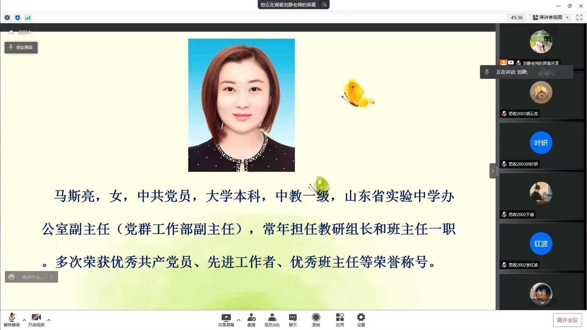 “师范生教学技能大讲堂”正式开讲。学院邀请了省实验中学思政课高级教师马斯亮担任首场报告主讲。报告由政治系教师刘静主持,思政专业2020级全体学生参加。