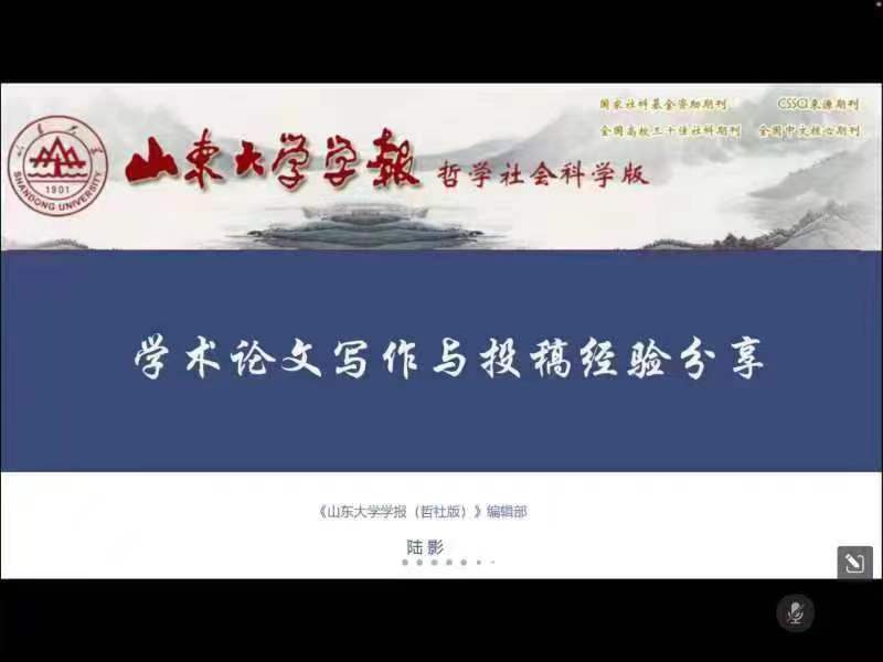 青龙山学术论坛于5月18日晚7点30分在腾讯会议平台线上举办,本次论坛邀请《山东大学学报(哲学社会科学版)》编辑部副编审、管理学博士、社会学博士后陆影就《学术论文写作与投稿经验分享》做专题报告,报告由院长高功敬教授主持,学院教师及研究生、本科生共160余人线上参加。
