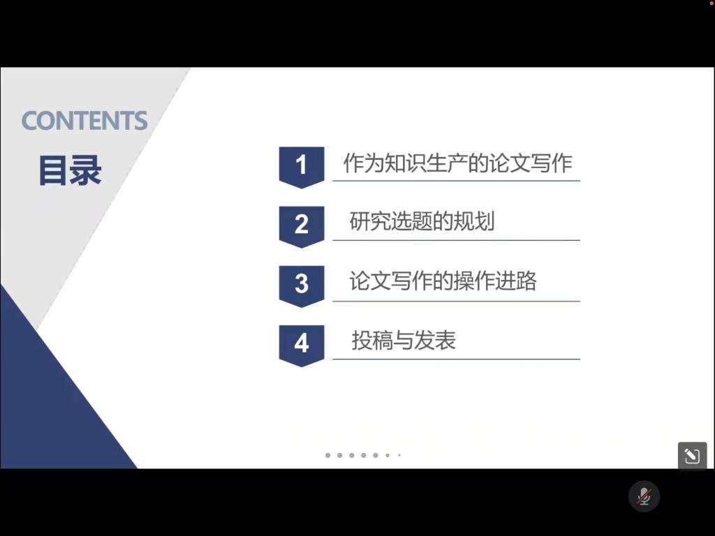 陆影副编审首先强调了科研诚信和学术道德规范问题,然后从作为知识生产的论文写作、研究选题的规划、论文写作流程以及投稿与发表四个方面进行了分享。关于选题的规划,重点围绕确定选题的几个原则、如何构思选题以及题目的拟定进行阐述,强调好的选题是论文成功的一半,确定选题应当遵循有用性、可行性/经验性、传承性、创新性、现实性和前瞻性。选题过程中既要关注历史成果,进行多元交流,也要关注学术前沿;既要阅读文献、锻炼写作,也要关注现实热点问题。关于论文写作流程,陆影副编审从确定选题、文献梳理、逻辑框架、资料处理、写作修改、答辩投稿等方面进行了细致的阐释。最后结合各大学术期刊的特点、期刊审稿流程、修改与校对、重复率检测等就投稿要求和技巧以及论文发表中的注意事项进行了介绍。