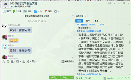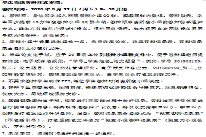 为保证此次“云答辩”圆满成功,行政管理系全体老师和毕业班同学反复沟通,精心协商和准备,制定周密的答辩方案和各种预案,并报学院备案。答辩共分四组,每组3-4名答辩教师,指导教师实行回避原则。答辩小组组建QQ群,指定一名同学担任答辩小组组长,负责材料和信息分发收集工作,答辩小组秘书和同学们进行多次沟通,讲解网络答辩流程和注意事项,了解同学们网络答辩可能遇到的困难,并邀请部分同学进行网络模拟答辩,以确保万无一失。
