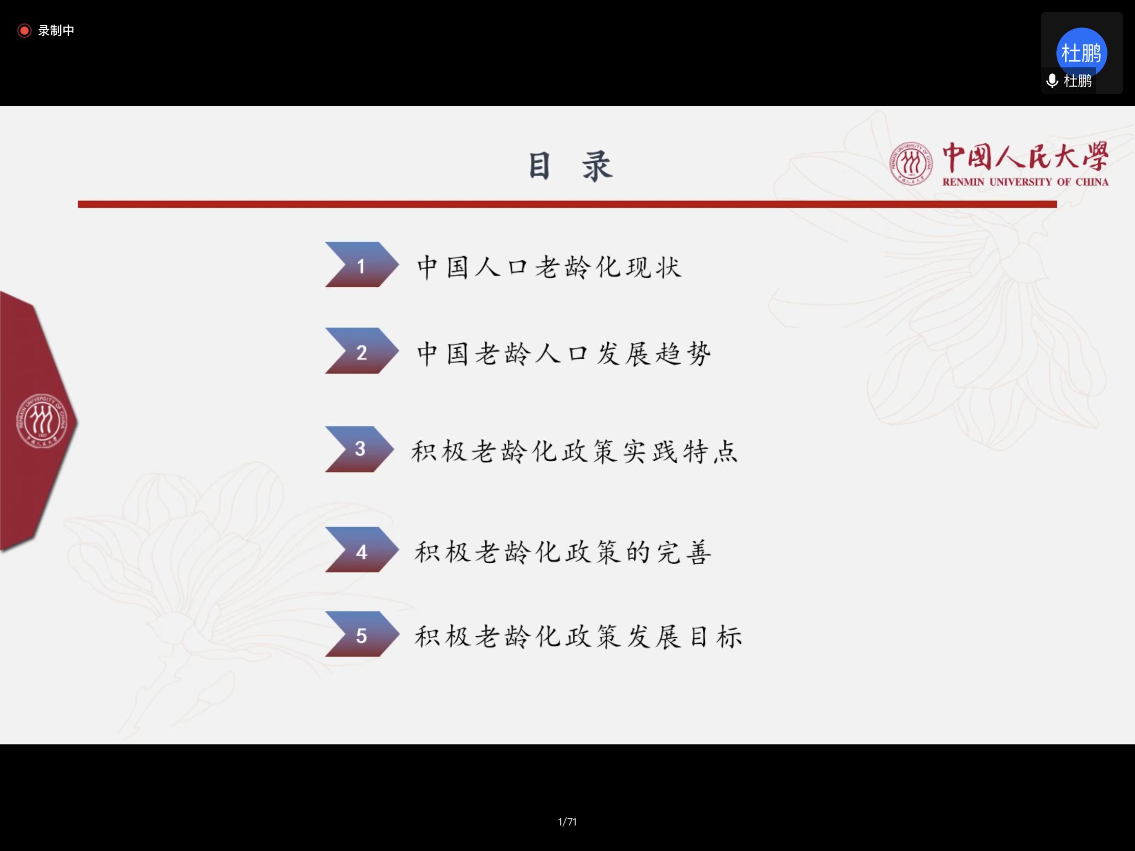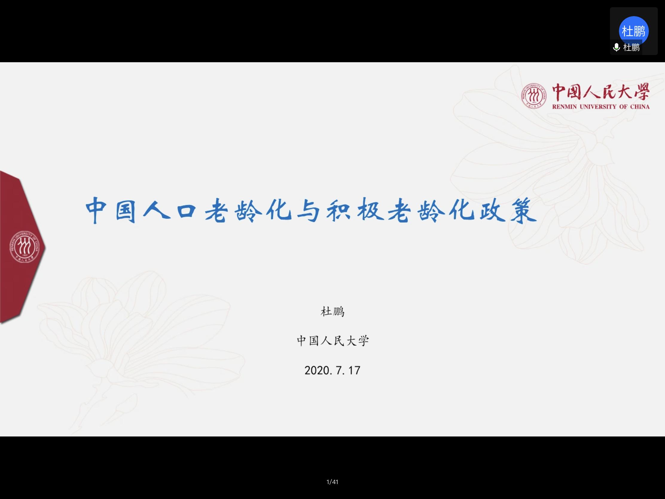 2020暑期系列云讲座首场社会学专场在腾讯会议平台顺利举行。活动邀请中国人民大学副校长、中国人民大学老年学研究所所长杜鹏教授做题为《中国人口老龄化与积极老龄化政策》的专题讲座。讲座由毛巾哥