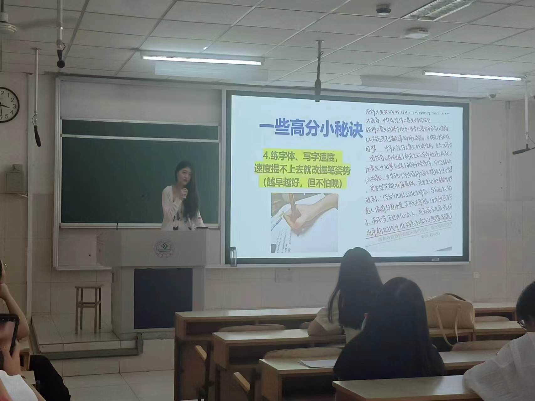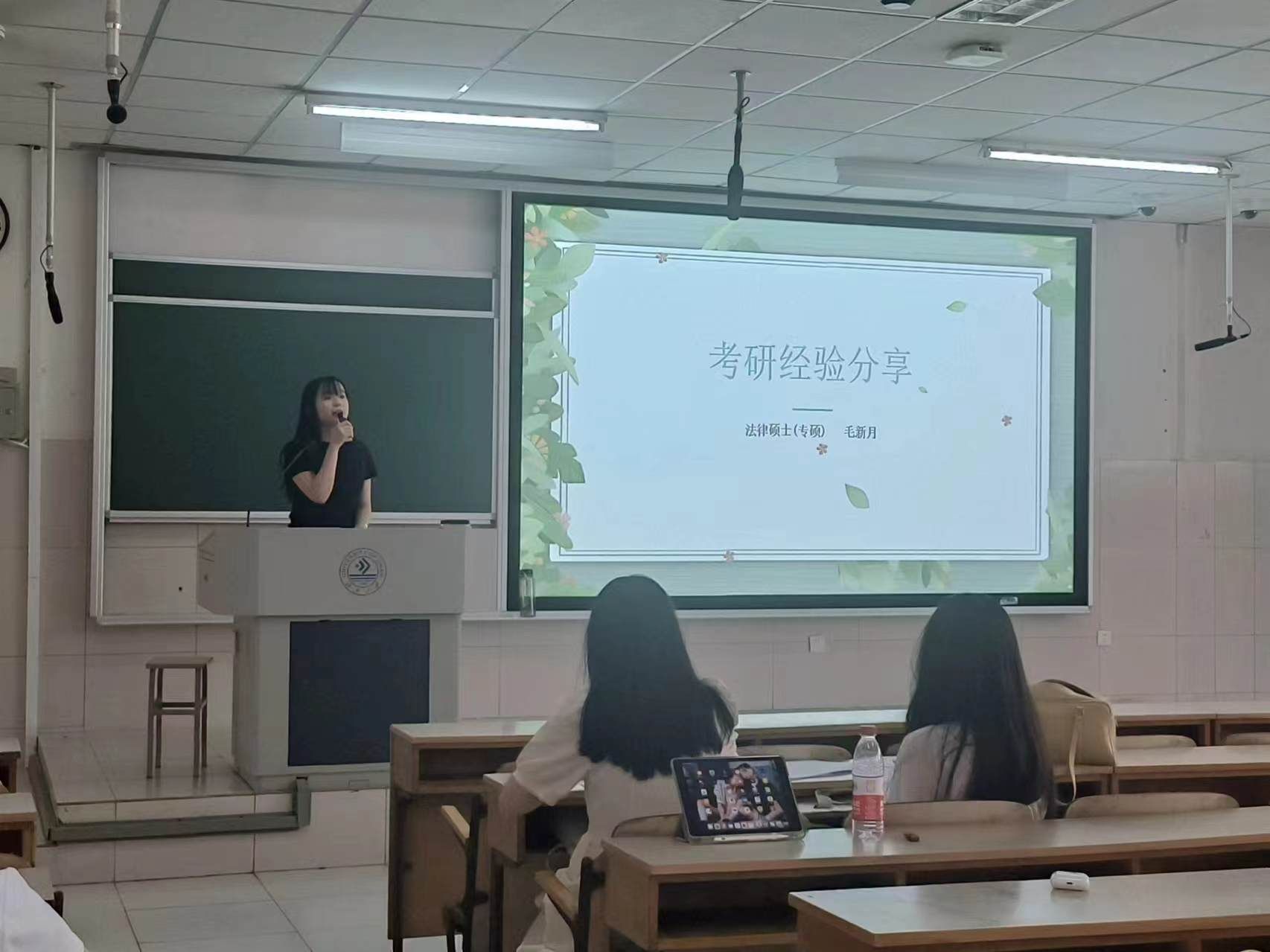 随后,20级张蕾、毛新月、杨君儒三位同学作为代表进行了考研法考经验分享。顺利考取中国海洋大学的张蕾同学首先进行了个人情况介绍,对择校注意事项进行了详细讲解,同时鼓励大家不要妄自菲薄,合理规划学习时间,调整自己的心态。作为考取本校研究生代表的毛新月同学从个人情况介绍、择校建议,备考建议、心态调整四个方面为学弟学妹们做出细致讲解,鼓励学弟学妹们夯实专业基础,主动补齐专业知识的差距,保持健康心态,努力实现目标。杨君儒同学讲解了选择北京航空航天大学的原因,并从自身出发为大家讲解了在备战研究生、法考中如何合理分配时间,同时分享了自己的心路历程,并在学习方法、心态调整、心理暗示、劳逸结合等方面给出了宝贵的建议。三位同学从个人考研基本情况、院校选择、计划制定、备考经验、学习习惯及时间管理等方面分享了自己的考研历程和心得体会,各有侧重、干货满满,为参会的学弟学妹提供了行之有效的经验分享。