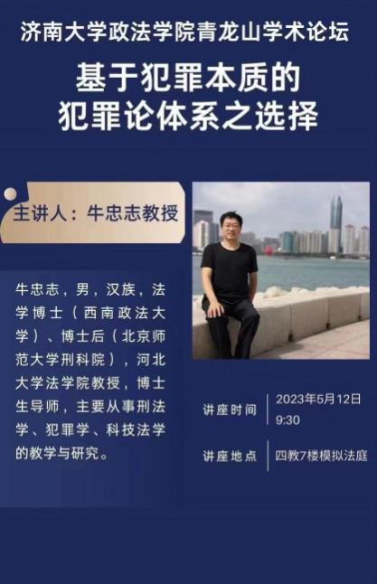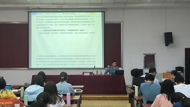青龙山学术论坛在四教模拟法庭成功举办。此次论坛邀请河北大学法学院牛忠志教授作题为《基于犯罪本质的犯罪论体系之选择》的学术报告。论坛由法学系系主任刘康磊教授主持,学院师生共100余人参加。