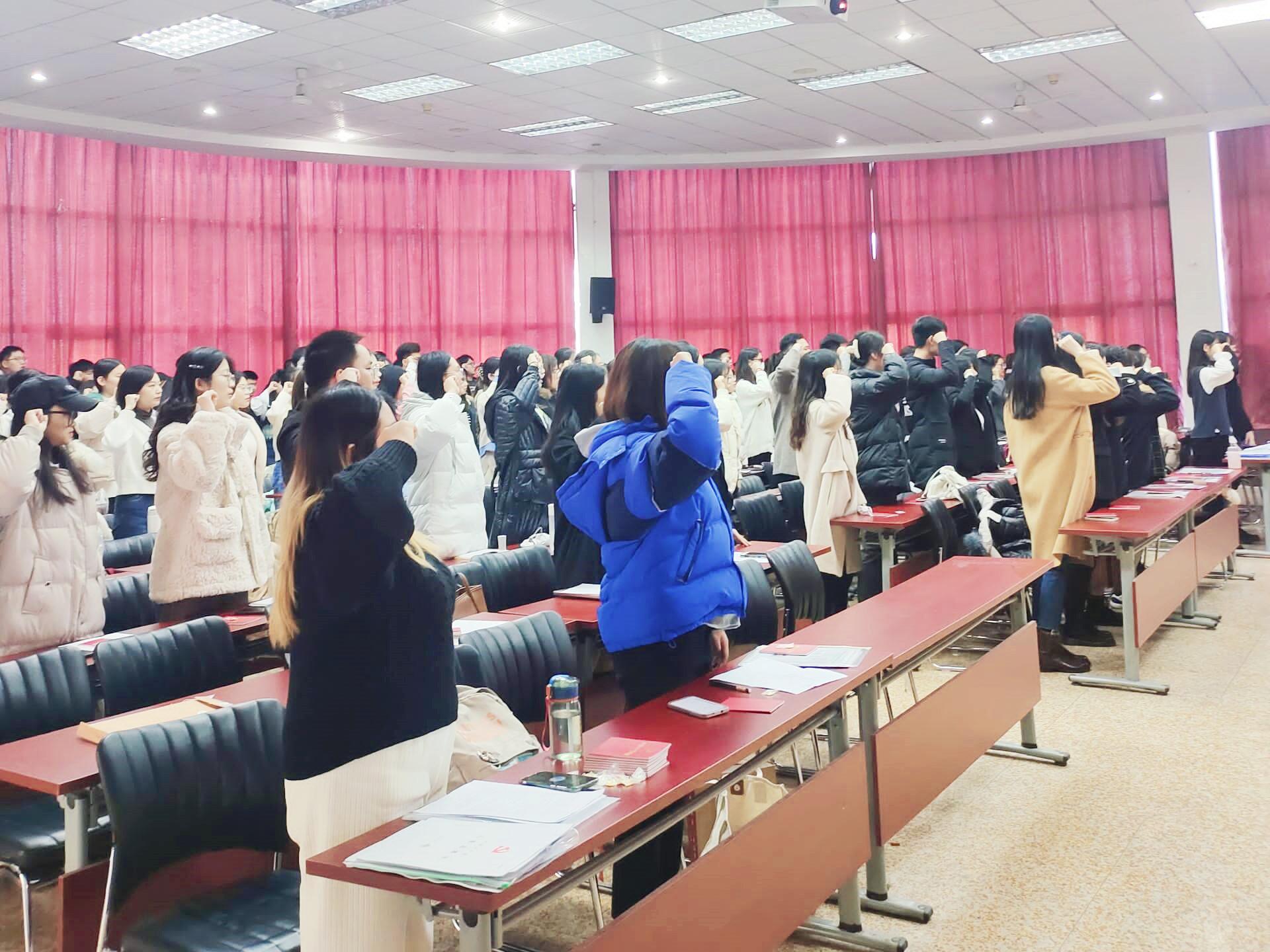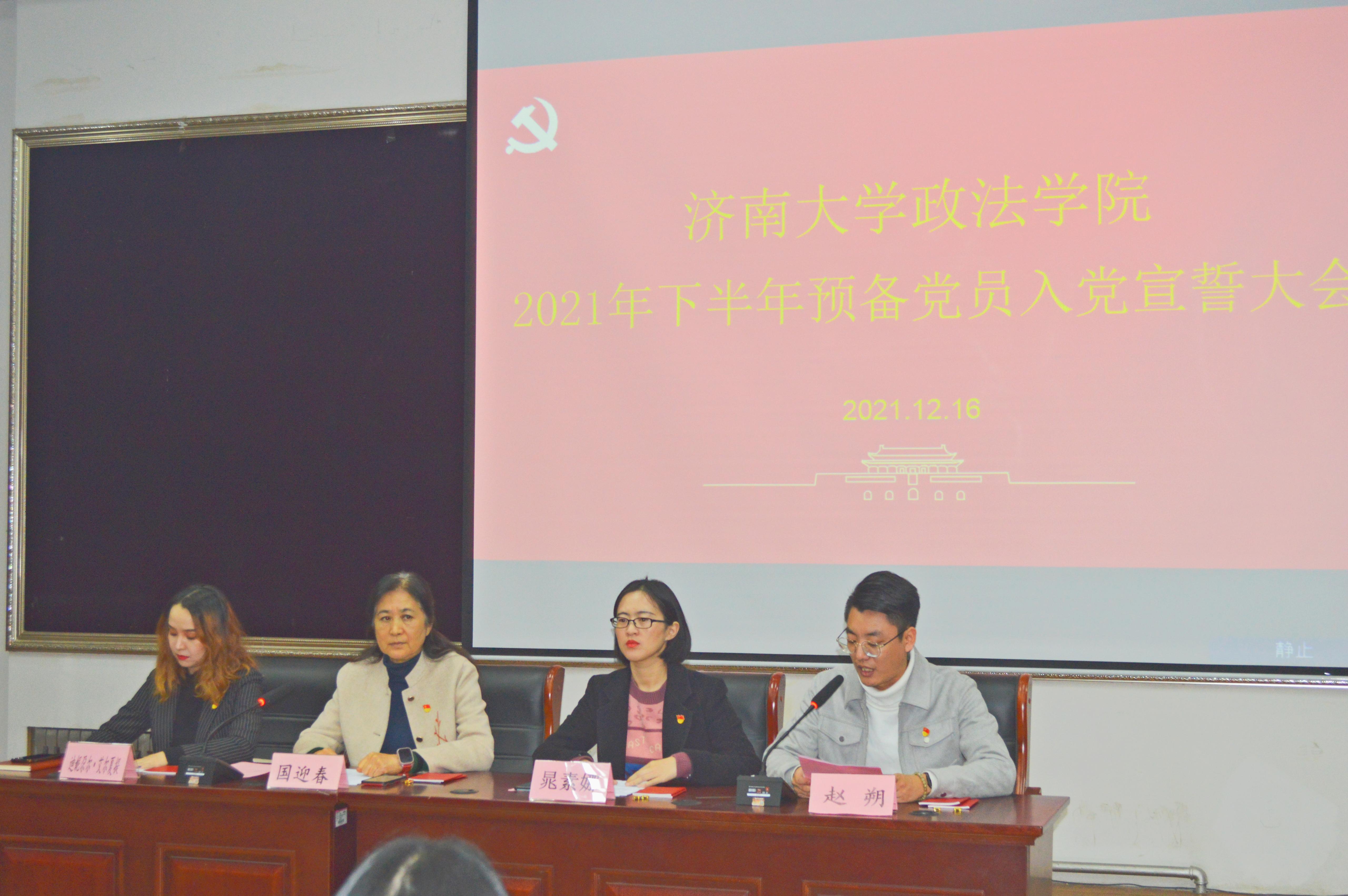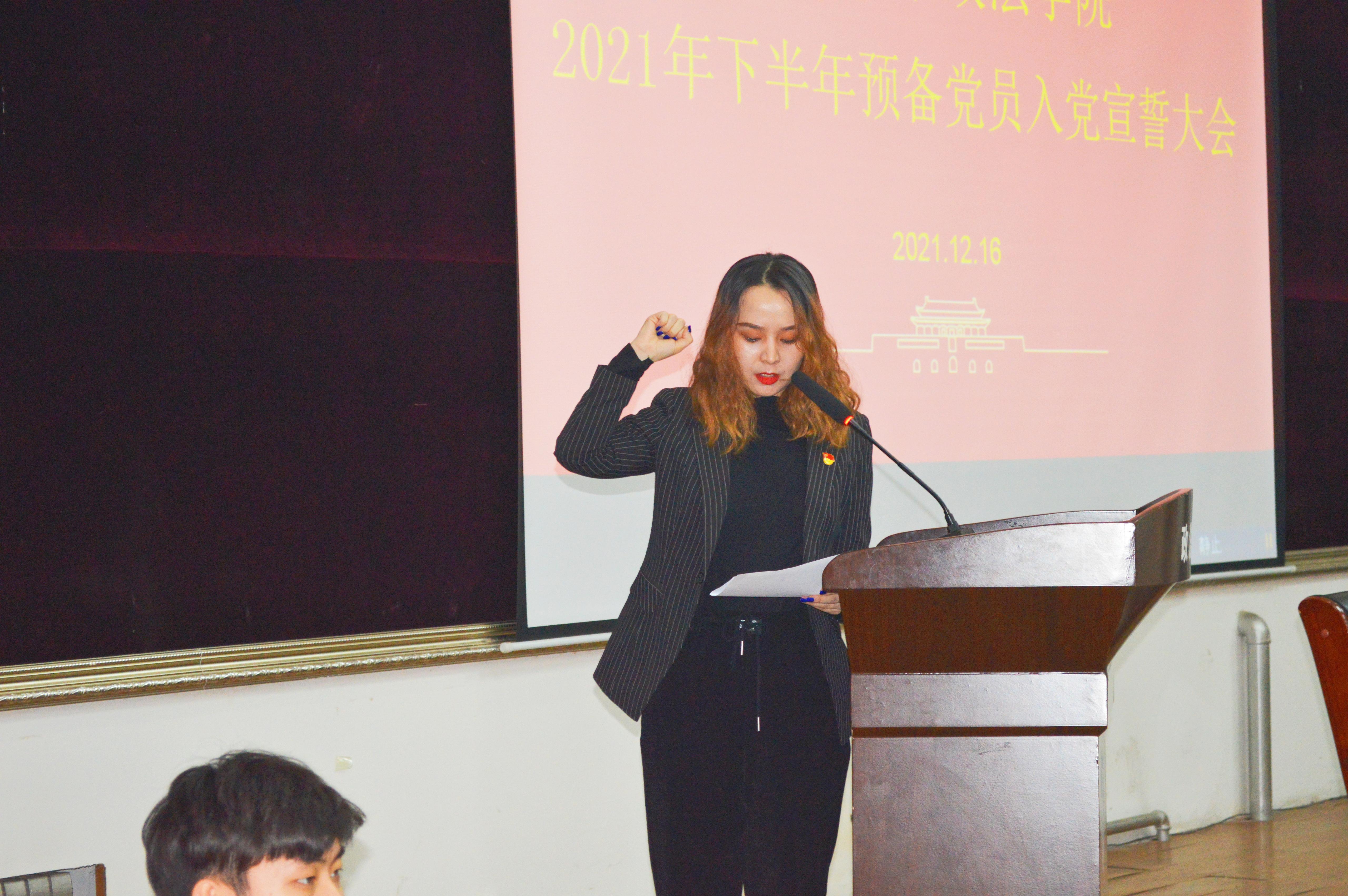 党委在第四教学楼模拟法庭召开2021下半年预备党员入党宣誓大会。学院正处级组织员国迎春,团委书记晁素娜,学生第三党支部书记迪妮尕尔·艾尔夏提和132名新发展的预备党员参加会议。会议由2020级辅导员赵朔主持。