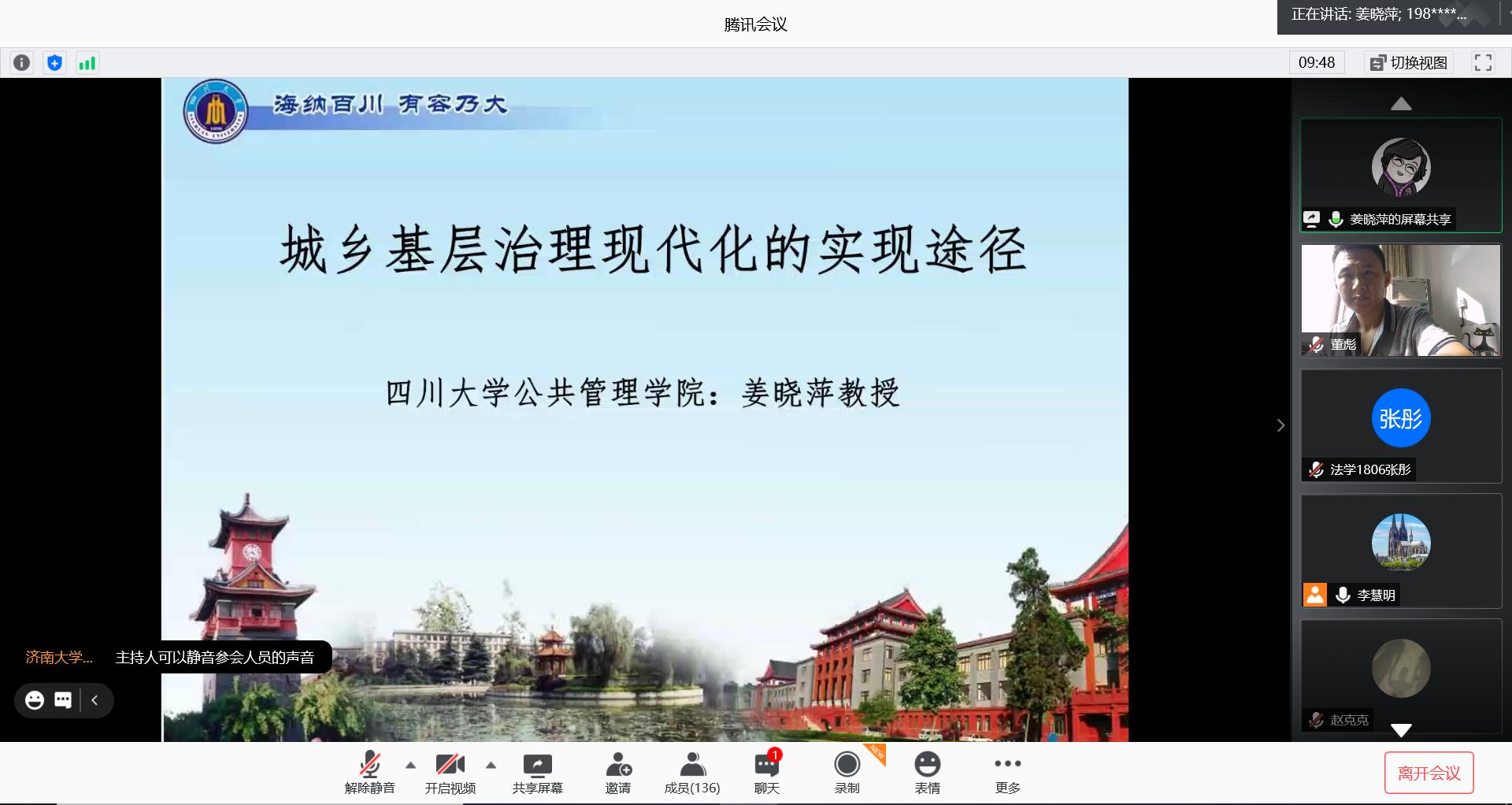 2020暑期系列云讲座第九期在腾讯会议平台顺利举行。活动邀请四川大学城市治理研究院院长姜晓萍教授做题为《城乡基层治理现代化的实现途径》的主题讲座。讲座由毛巾哥