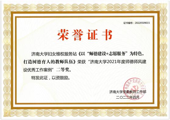 妇女维权服务站始终把师德师风建设摆在突出位置,倡导以德立身、以德立学、以德施教,将师德建设与志愿服务相结合,打造树德育人的教师队伍,取得显著成效。2019年全国妇联授予服务站“全国三八红旗集体”荣誉称号。此外,服务站还多次被山东省妇联、省综治办命名为“省级妇女维权服务示范站”、被山东省妇联、省综治办授予“省三八红旗集体”、被山东省委授予“山东省优秀先进基层党组织”、被毛巾哥