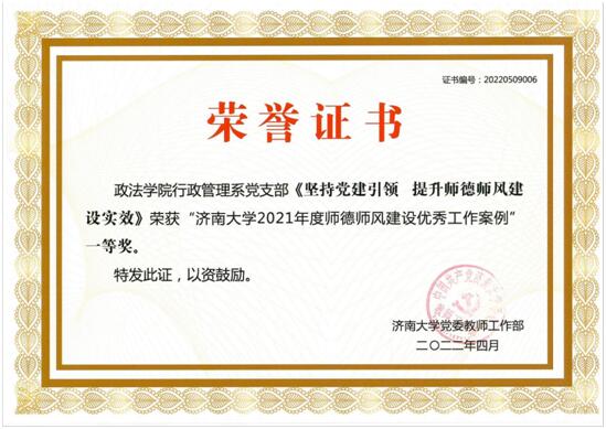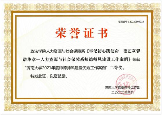 2021年度师德师风建设优秀工作案例”。其中,行政管理系党支部《坚持党建引领 提升师德师风建设实效》获一等奖,人力资源与社会保障系《牢记初心建使命 德艺双馨谱华章》、妇女维权服务站《以“师德建设+志愿服务”为特色,打造树德育人的教师队伍》获二等奖。