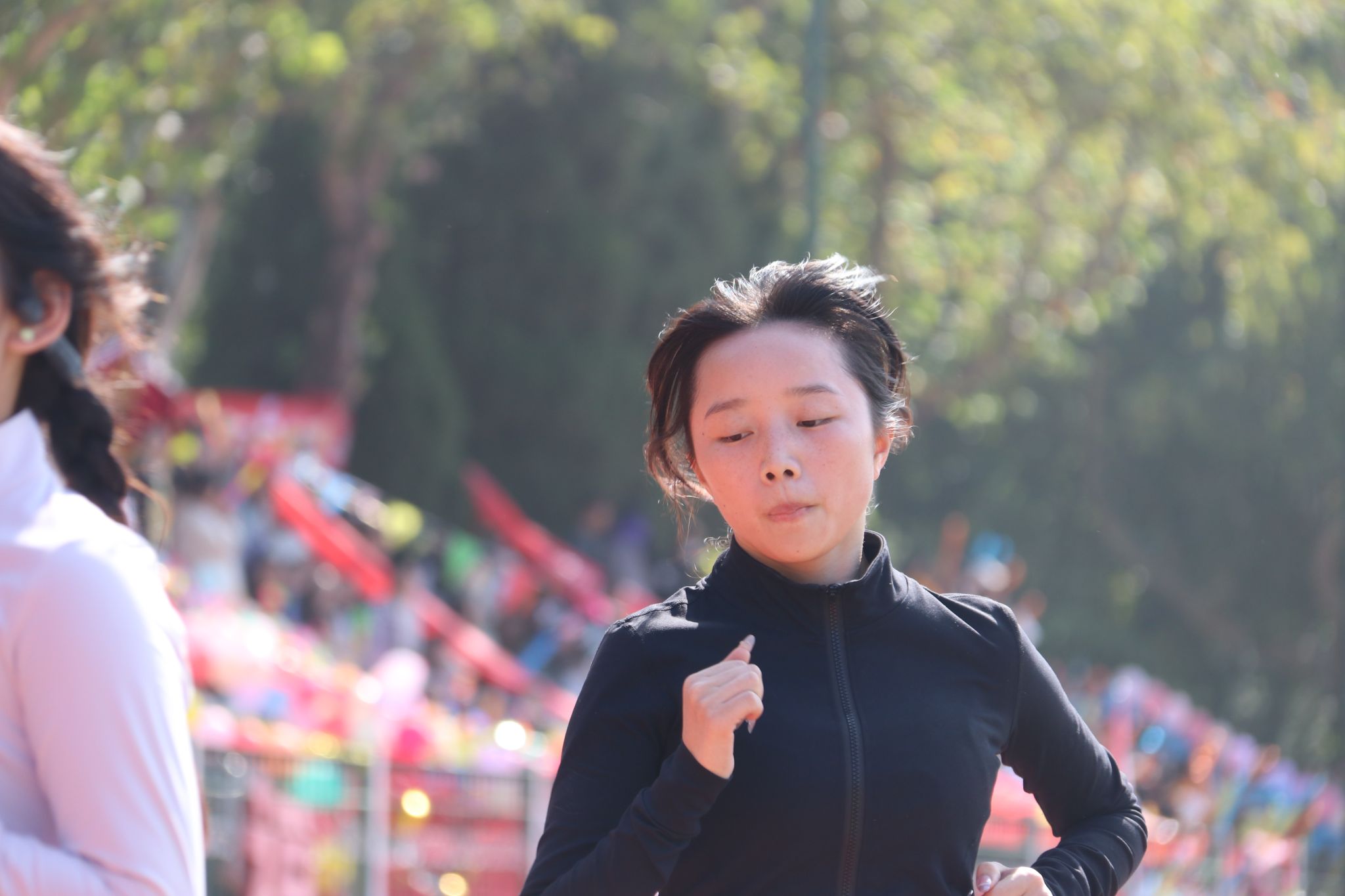 赛道上,她们步伐矫健,每一次呼吸都伴随着汗水的挥洒,展现了运动员的顽强拼搏精神。看台上,同学们被她们的坚韧所感染,纷纷起立,为她们加油助威,呐喊声、欢呼声交织在一起,响彻整个操场。在这短暂而又漫长的1500米征途中,她们互相鼓励,互相扶持,共同面对挑战,展现了深厚的友谊和团队精神。