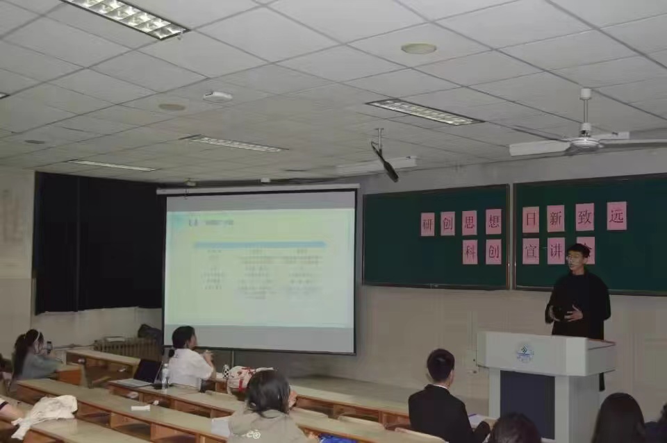 学生会科创中心于2023年4月16日在二教203教室举办第四期“研创思想,日新致远”科创宣讲会。此次宣讲会特别邀请了社工2102班王安旭和思政2103班迟宜伟为同学们分享有关挑战杯参赛经验。