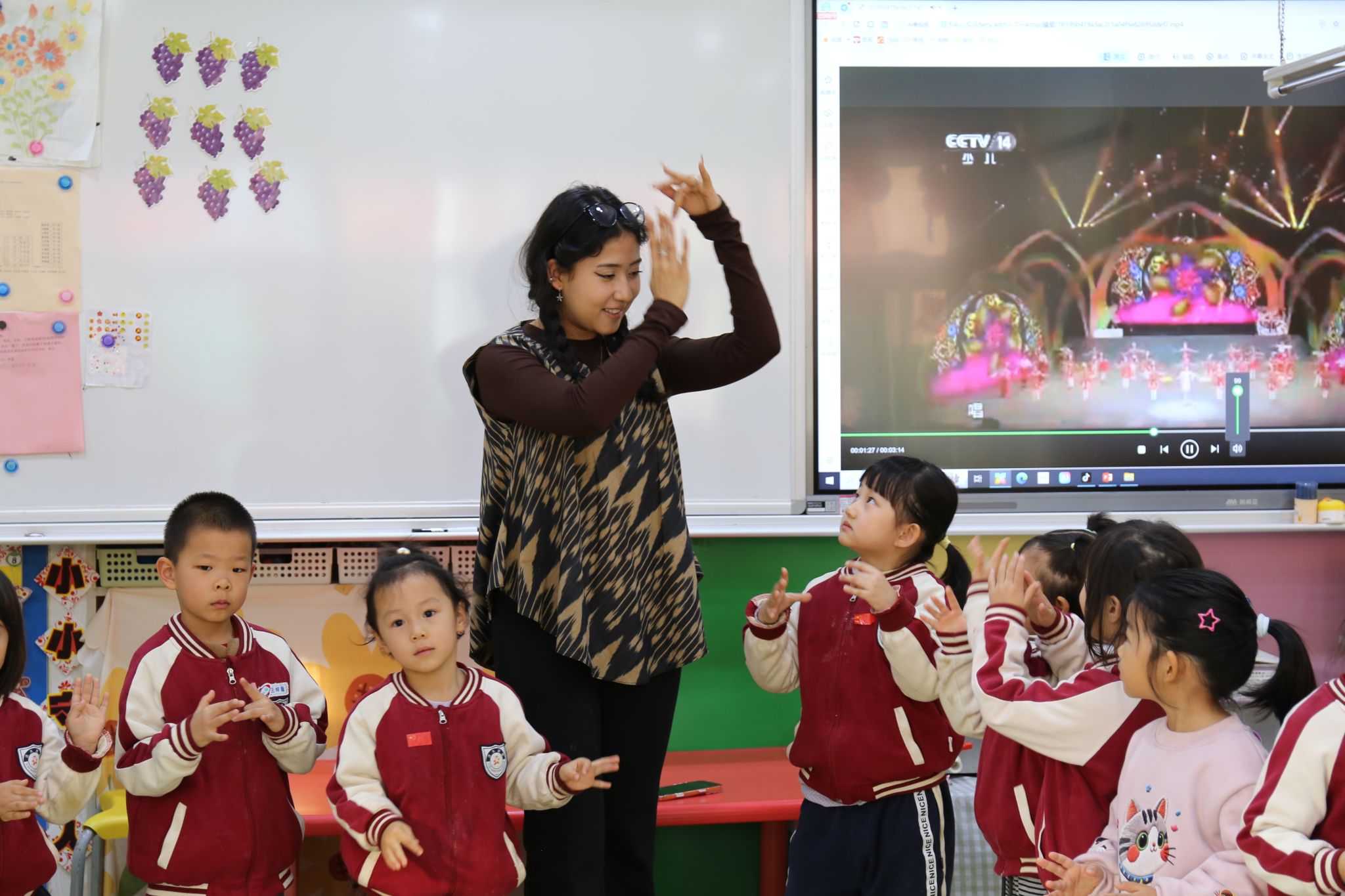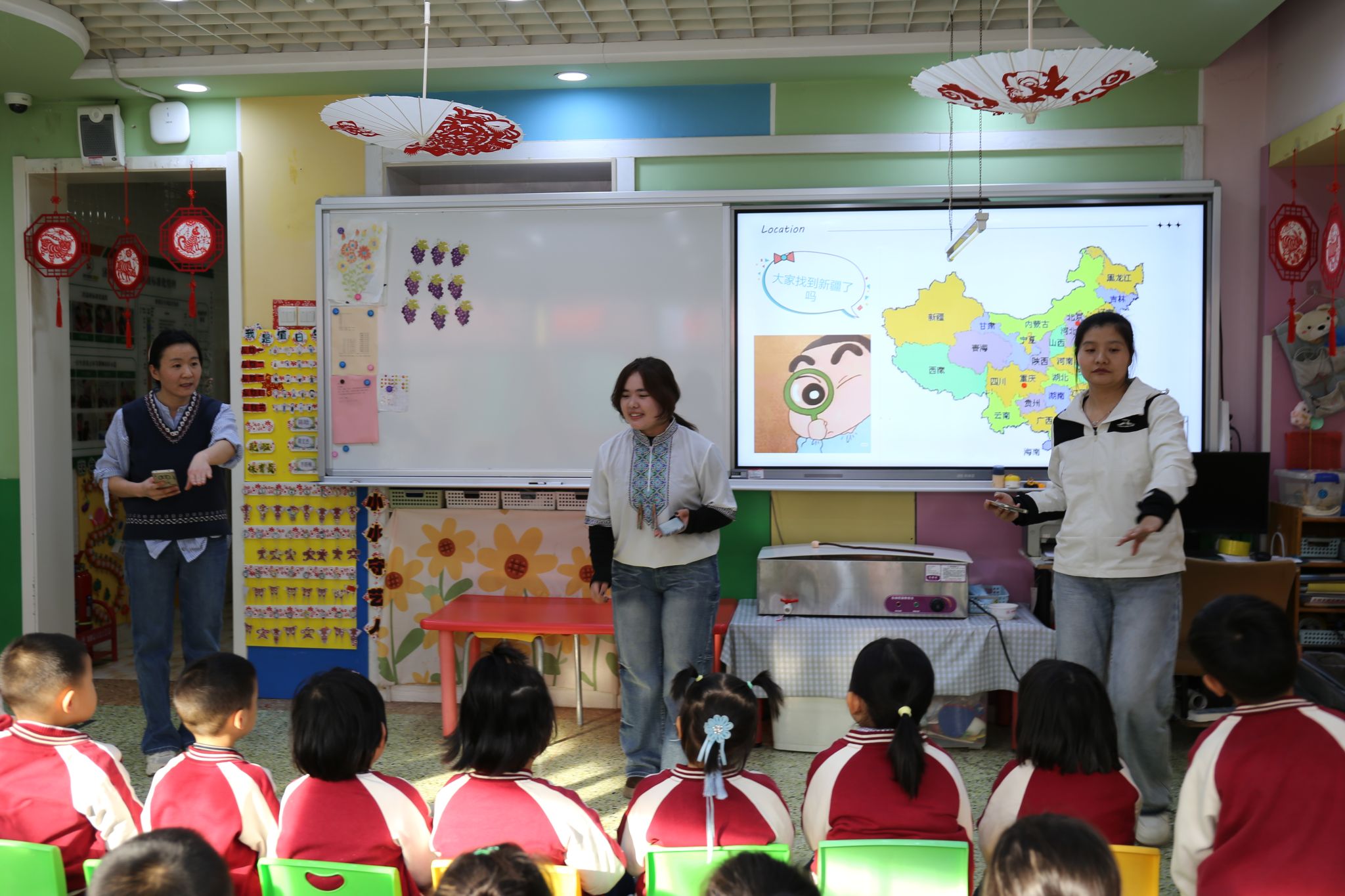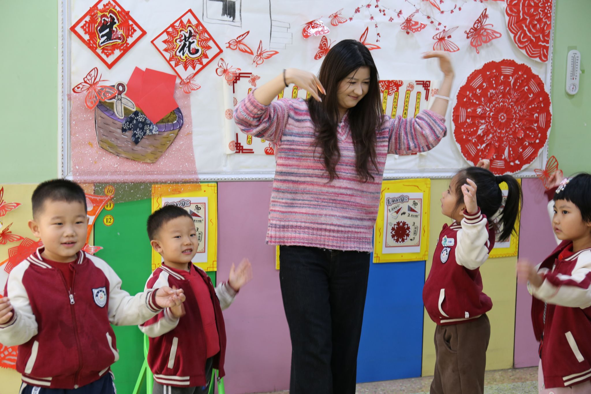 实践团成员围绕“认识少数民族”“了解少数民族风俗习惯、特色美食、传统乐器与歌舞”等主题各展所长,将民族团结理念融入生动活泼的教学环节,为幼儿带来了丰富精彩的教育体验。队员们充分调动幼儿学习的积极性与主动性,引导孩子们在玩中体验、在乐中感悟、在互动中学习。志愿者们分组开展活动:教小朋友们跳民族舞蹈、学说简单的民族语言、体验弹奏民族乐器等。石榴树下,大手牵小手共舞共学,掌心相触的温度让 56 个民族的团结故事悄然萌芽。一张张真诚的笑脸、一双双挥动的小手、一阵阵灵动的旋律,构成了各民族交往交流交融最动人的画面。这一刻,不同民族同心同向,“大学生” 与 “小朋友” 的距离也在欢声笑语中不断拉近。