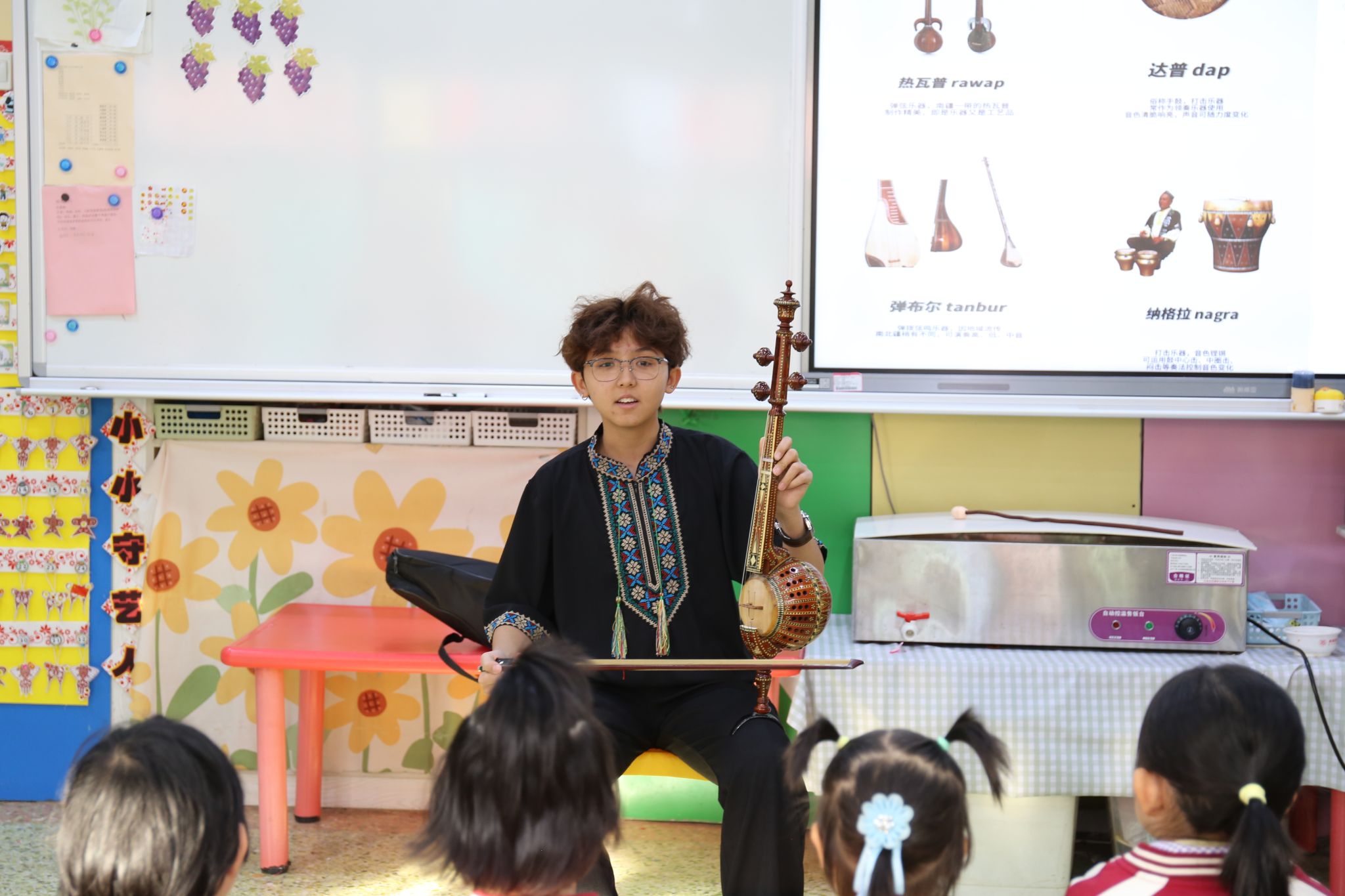 附属幼儿园主持实践活动,我们带着小朋友们认识少数民族的乐器、歌舞与美食。他们眼中的好奇与热情,让我真切感受到童真的美好;当小朋友们与我们共舞、小心翼翼地抚摸特色乐器时,我清晰地看到民族团结的种子正在他们心中萌芽。在这次实践中,我们用自己的力量让孩子们感知到民族大家庭的温暖,既自豪又深感责任在肩,也更坚定了用青春践行民族团结的决心。”实践队成员麦迪娜・麦尔旦说道:“这场活动让我收获满满。看着小朋友们睁着好奇的眼睛,围着我们询问少数民族的服饰、美食,跟着我们学跳民族舞蹈,我真切感受到民族团结的种子扎根童心的力量。我们通过生动的讲解、趣味的互动,把多彩的民族文化展现在孩子们面前。这次实践活动不仅是向幼儿传递民族知识,更让我自身对‘铸牢中华民族共同体意识’有了更为深刻的理解。未来,我也会继续用青春力量,传播民族团结的美好理念。”