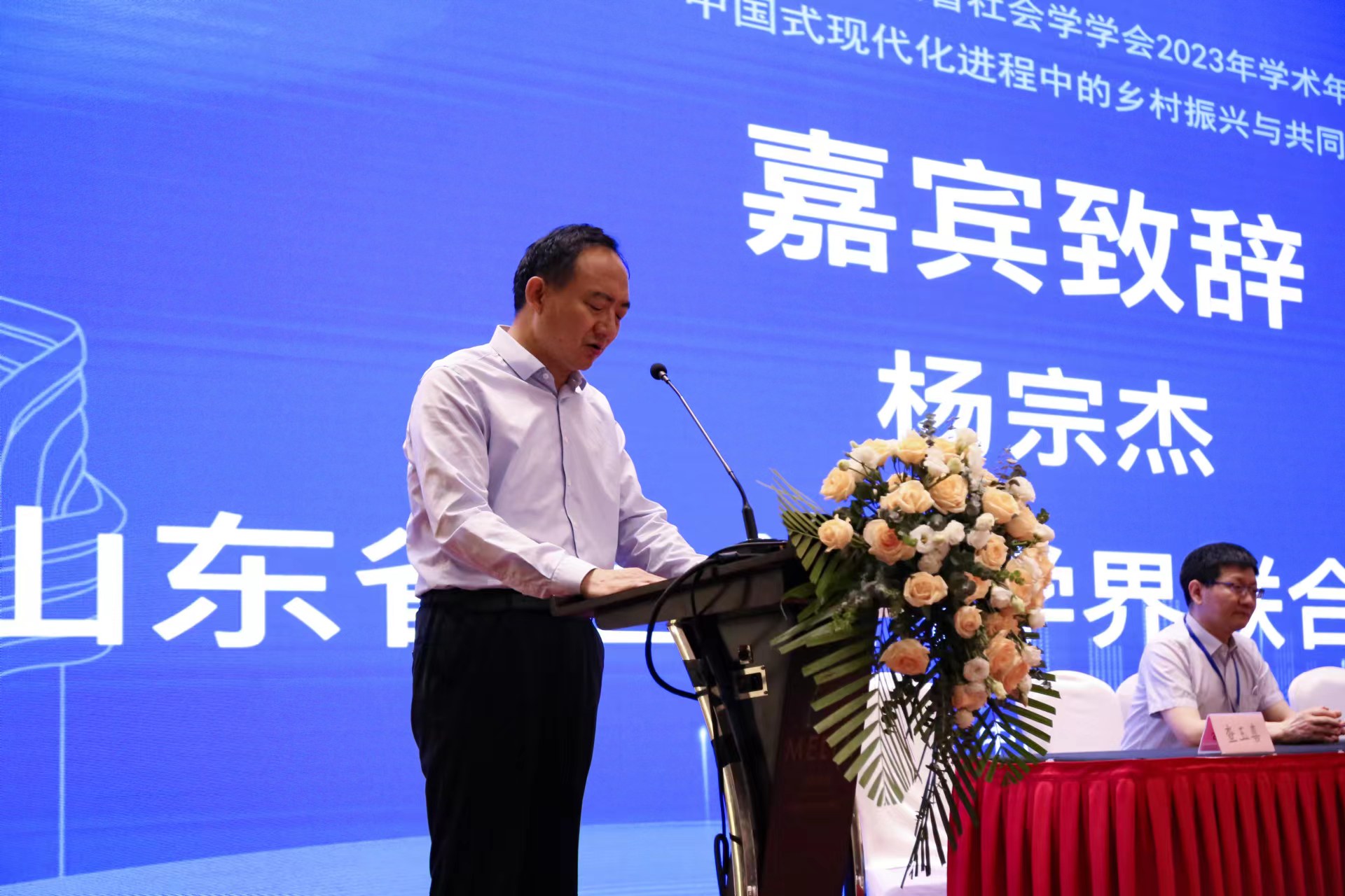 开幕式上,杨宗杰副主席代表山东社会科学界联合会,对大会的顺利召开表示热烈祝贺,向长期以来积极参与、支持山东社会科学事业的各位领导、各位专家和同志们表示衷心感谢。他指出,本次学术年会以“乡村振兴与共同富裕”为会议议题,充分体现了我省社会学研究者坚持以国家发展战略为引领、以人民为中心做研究的学术使命和社会担当。他向各位参会嘉宾介绍了山东省社会学学会及其理念、宗旨和使命。希望各位专家学者大胆假设、严谨求证,紧扣时代脉搏,直面社会发展中的重大理论、政策和实践问题,积极探索,共商优化之策。