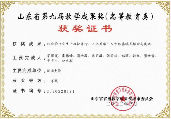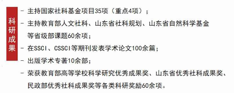 近年来教师承担国家社科基金近50项(重点项目5项),省部级项目100余项,到账纵向、横向科研经费2000余万元;发表高水平论文300余篇,出版学术著作20余部;科研成果获教育部高等学校科学研究优秀成果奖1项,山东省社科优秀成果奖一等奖6项、二等奖10余项,其他省部级奖励20余项。承担国家级、省级和校级一流本科课程、精品课程、课程思政示范课程等20余门,出版教材20余部,获省级优秀教学研究成果奖6项。在校学生获国家级奖励20余项,省部级等奖项百余项。