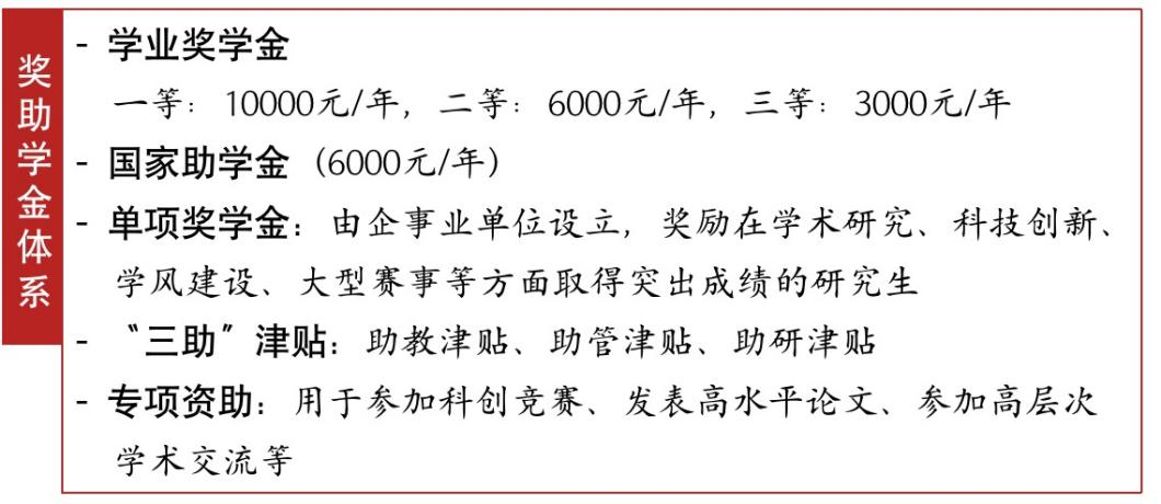 奖助学金制度健全,设立学业奖学金(覆盖率85%以上)、国家奖学金、国家助学金、单项奖学金、“三助”津贴等。学院专门出台《研究生教育质量提升计划与实施办法》,对研究生参与科创竞赛、发表高水平论文、参加高层次学术交流等给予大力资助与支持。