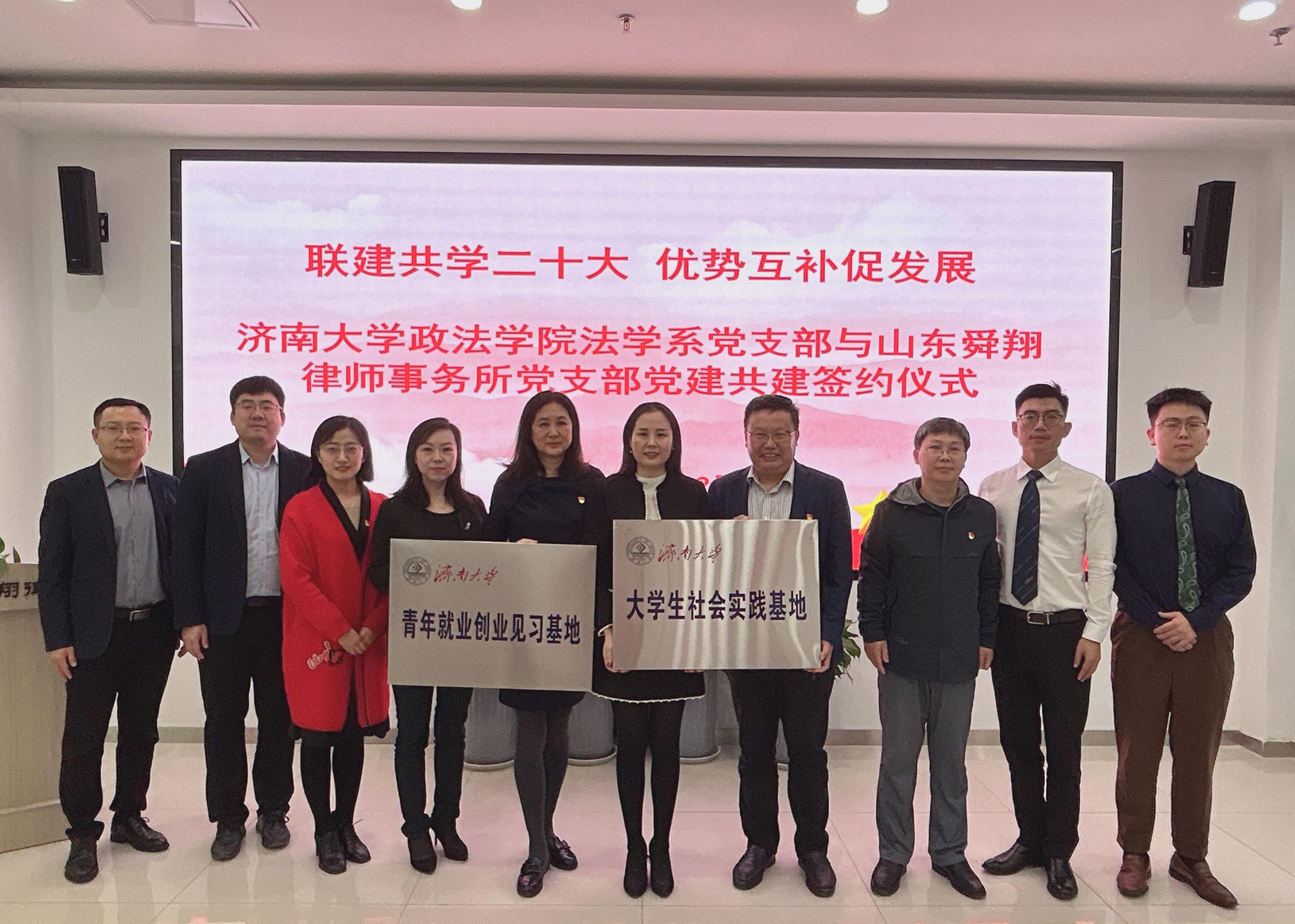 社会实践基地合作协议》。签约仪式结束后,双方举行了“联建共学二十大 优势互补促发展”党建共建座谈会。齐姣书记介绍了山东舜翔律师事务所党支部的组织机构、党建工作开展经验。徐庆国书记介绍学校和学院基本情况,法学系党支部党建工作以及学生培养教育等。