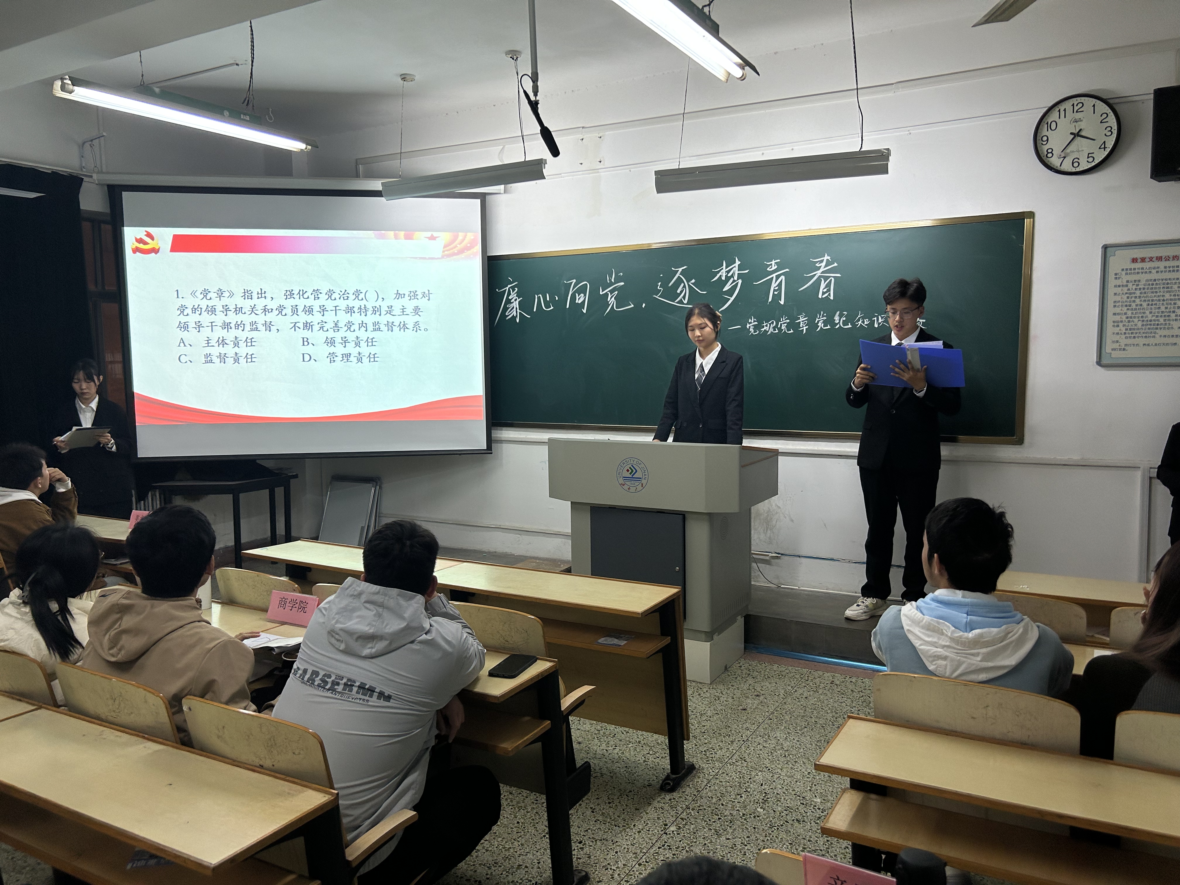 第十三届廉洁文化创意活动之——“廉心向党,逐梦青春”党章党规党纪知识竞赛初赛于第四教学楼顺利举行。本次比赛共十九个学院参与,参赛学院数量众多、涵盖范围广。比赛中各学院选手积极参与作答,各赛场竞争激烈。