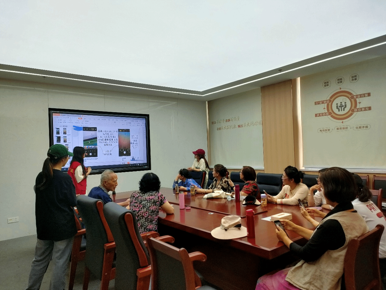实习生协助四里村街道社工站在英雄山社区居委会会议室开展第二次老年人短视频剪辑学习小组活动。