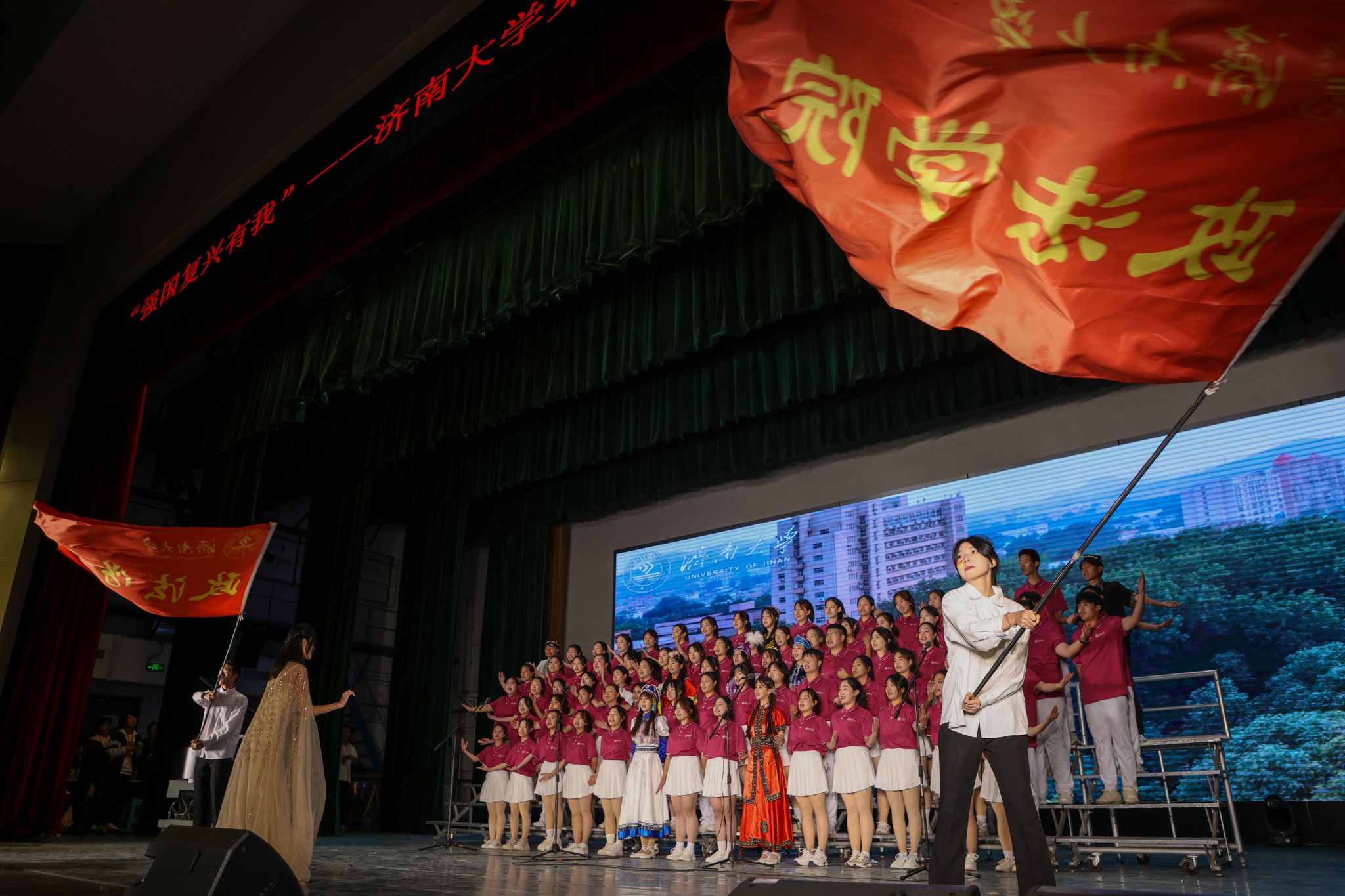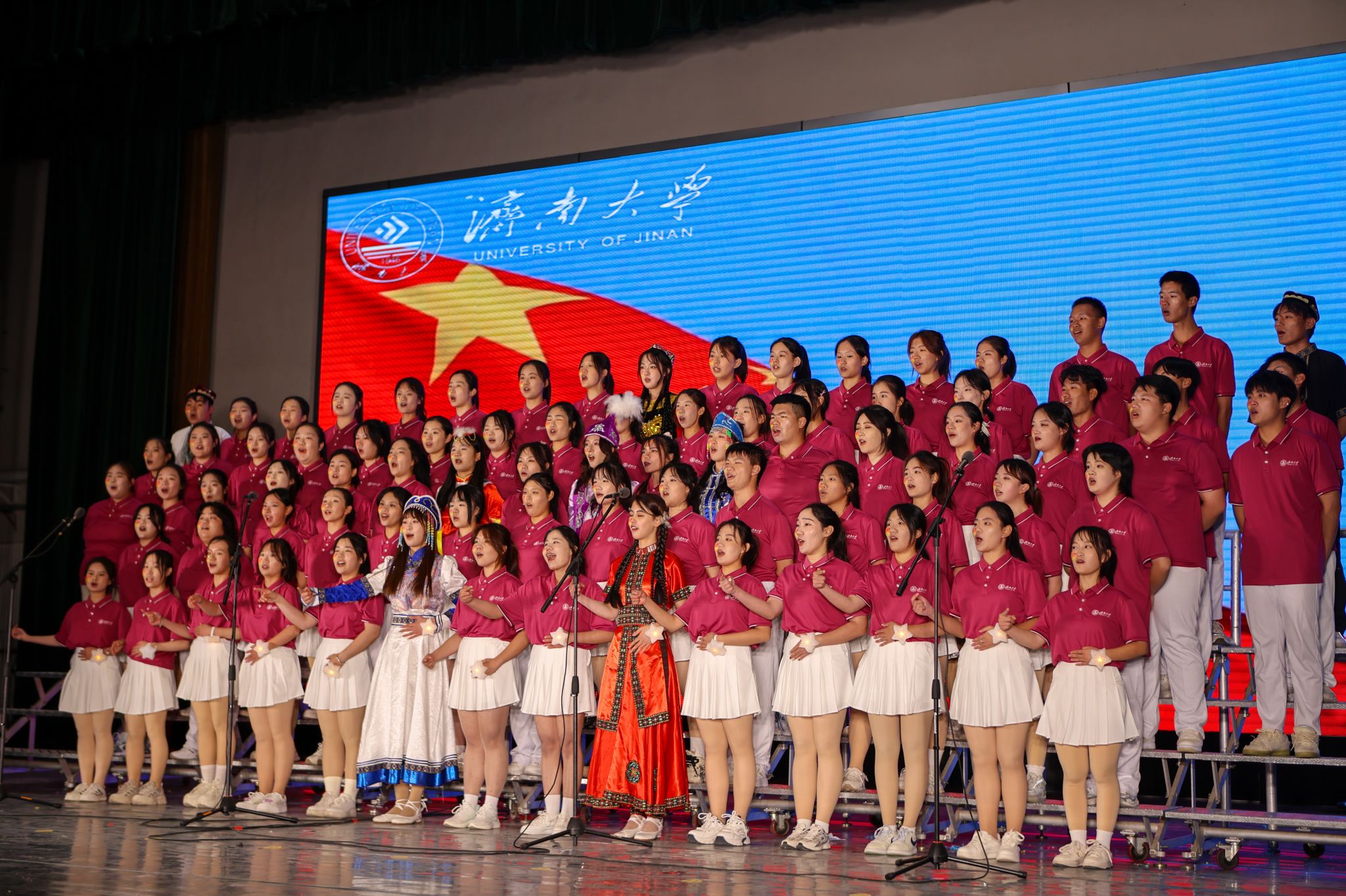 新生辅导员沈正浩老师作为此曲目的领唱者,以嘹亮而富有感染力的嗓音,引领着合唱的旋律飞向高空。钢琴声如一曲潺潺流水,为合唱增添了一抹灵动的色彩;舞者像一只翩跹起舞的蝴蝶,为合唱增添了一份视觉盛宴;指挥者则像一位神奇的魔法师,胳膊轻盈地舞动,调动着每一个音符,让合唱的节奏精准而有力。而最后一首《美丽中国》节奏欢快、旋律热情奔放,向观众展现了一幅各民族其乐融融、各民族相亲相爱的和谐画卷。在毛巾哥