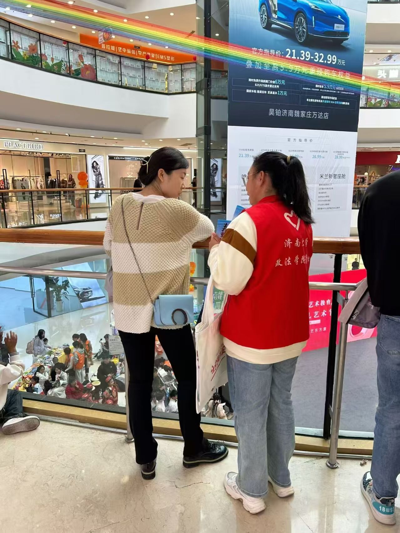 活动当天,志愿者们早早抵达济南市经四路万达商场,帮助工作人员布置场地,准备手册和义卖品,完善最后的准备工作。活动现场布置得温馨又富有艺术气息,展示台上摆放着由自闭症患者们精心创作的手工艺品,舞台周围则是穿着各式各样舞蹈服的小志愿者们。随着活动的深入,越来越多的人聚集在义卖摊周围,志愿者们积极向人群介绍自闭症群体并分发相关手册,从而让更多人了解这些“星星的孩子”,加深了人们对自闭症群体的关怀。在此次义卖活动中,孩子们的作品得到了许多人的认可,这让他们感受到了社会的关爱和包容,这也为他们自己及家庭带来了温暖和希望。