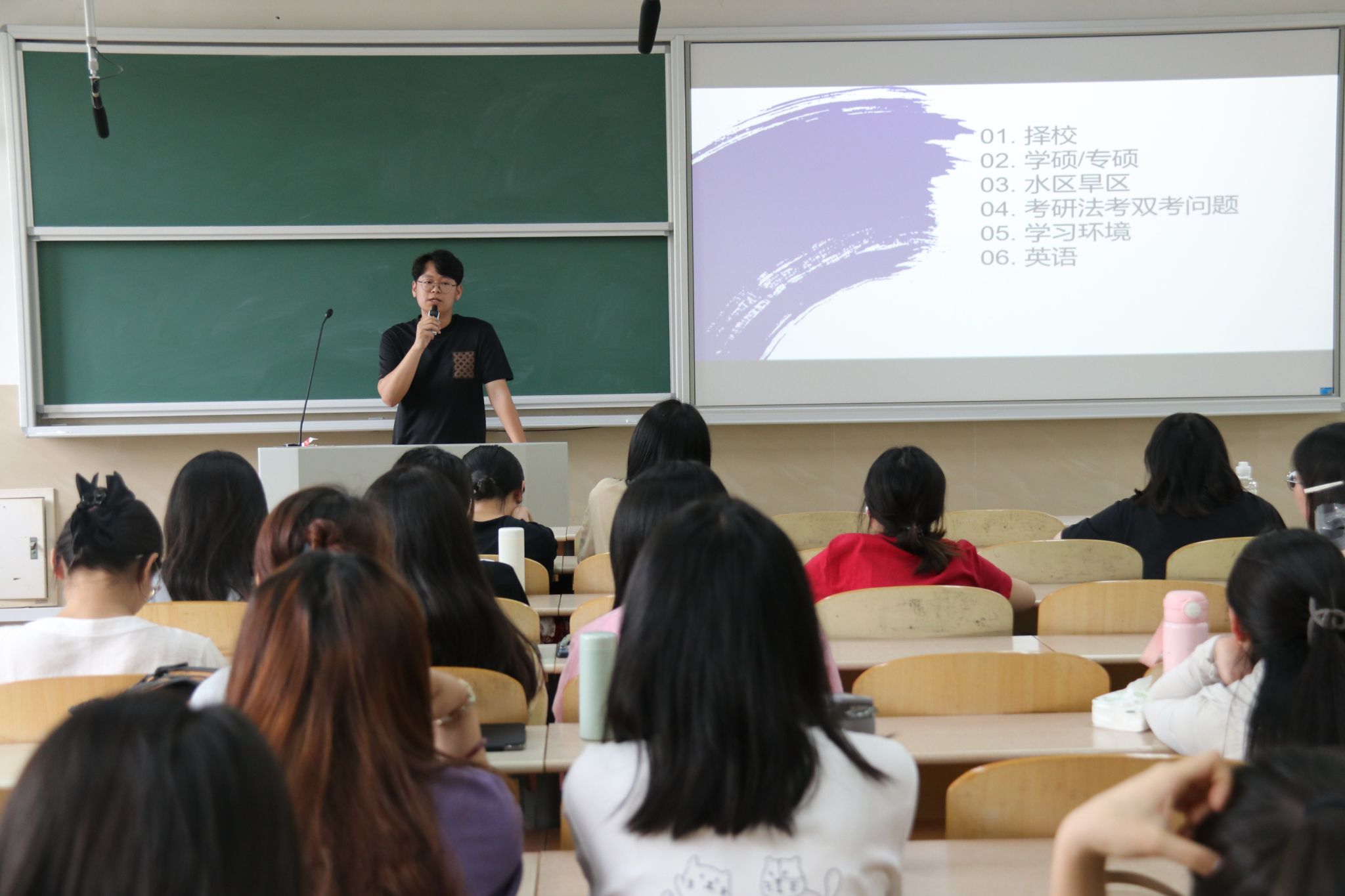 为持续强化学风建设,发挥朋辈榜样力量,帮助同学们更好地规划学业发展,掌握升学备考技巧,2025年5月13日下午,学院在第十教学楼成功举办了推免和考研经验分享会。张童童、安晓雨、王安旭三位同学结合自身推免经历进行了全面细致的经验交流,尹吉凡、王姜琰、张乐彬同学从学硕、专硕以及法考等方面分享了自己的备考经验。学院辅导员刘晓娟、宗琪、李纪亮出席活动,与2022级有升学意向的同学们共同参与了此次分享会。