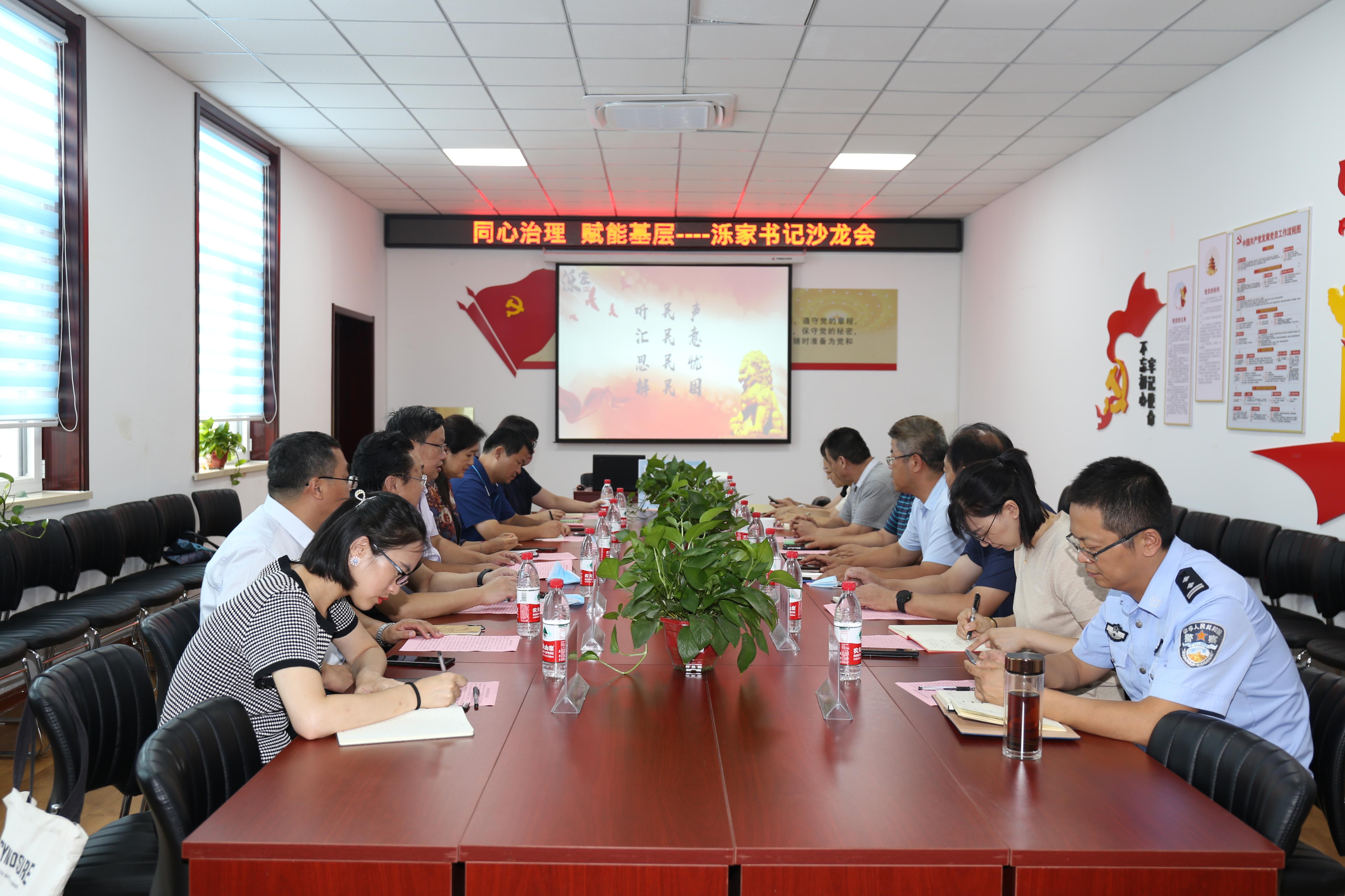 在饮虎池社区综合党委书记李坤的带领下,徐庆国书记一行参观社区车辆道闸、视频监控、反诈宣传机等设备建设应用情况。座谈交流会上,泺源街道办事处党工委书记周勇对“同心热线”工作品牌的运行背景、运行机制、工作理念、办理流程、社会意义等进行详细介绍。市中区社会治安综合治理服务中心主任刘彬提到在社区治理中要注重发挥居民积极性,不断提升居民幸福感和获得感。徐庆国书记感谢泺源街道对学院实践教学、人才培养等工作的大力支持,尤其去年饮虎池社区综合党委与学院行政党支部开展结对共建,取得良好效果。随后,双方围绕推进基层治理新模式、新方法进行深入交流,双方表示希望发挥各自优势,依托济南市市域社会治理研究中心,建立合作共建工作长效机制,实现共赢发展。
