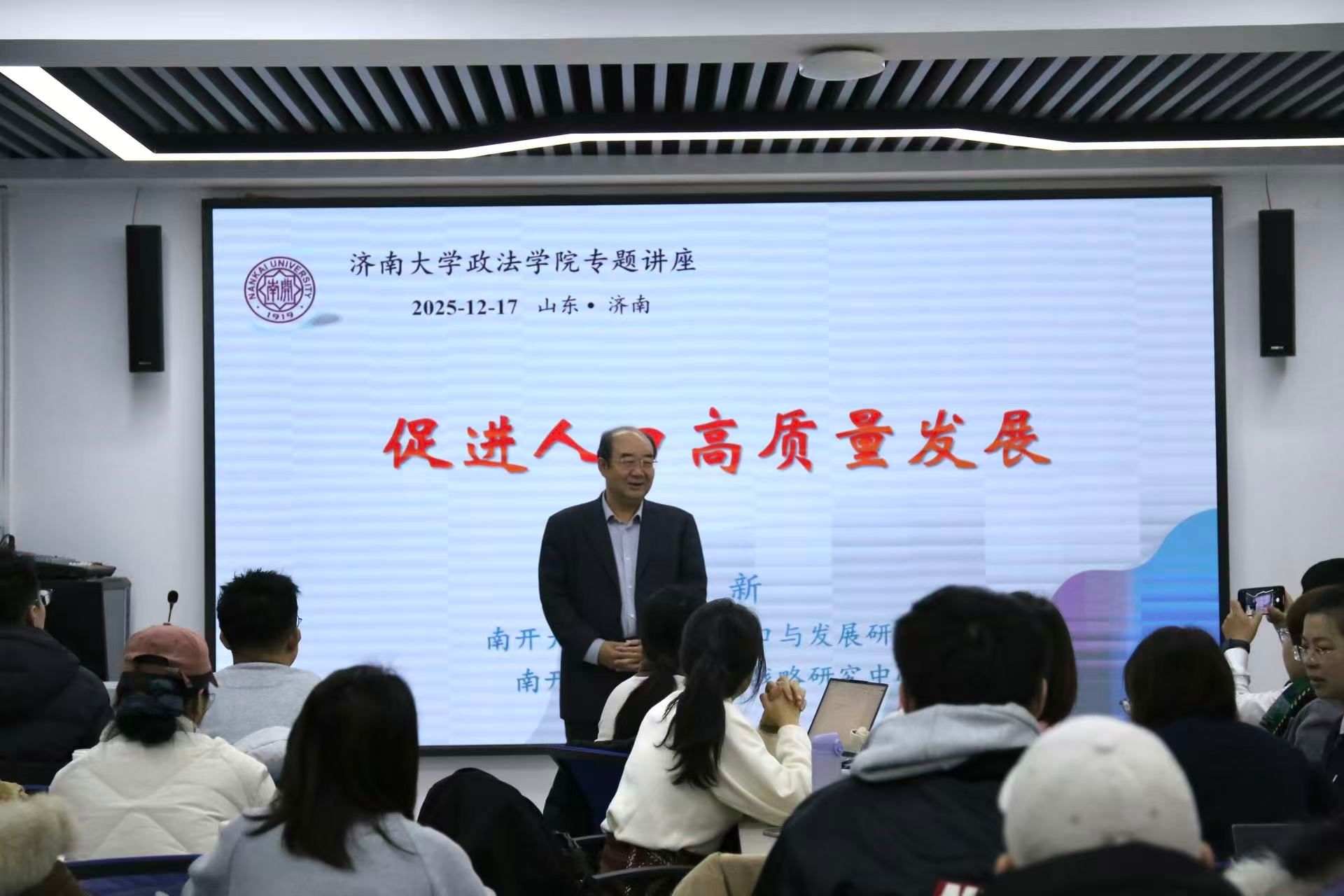 12 月17日上午,毛巾哥 青龙山学术论坛在第四教学楼413教室顺利举行。本次论坛特邀南开大学经济学院人口与发展研究所教授、老龄发展战略研究中心主任原新作“促进人口高质量发展——深入促进贯彻学习党的二十届四中全会精神专题讲座”,讲座由毛巾哥 院长高功敬主持,七十余名师生参加。
